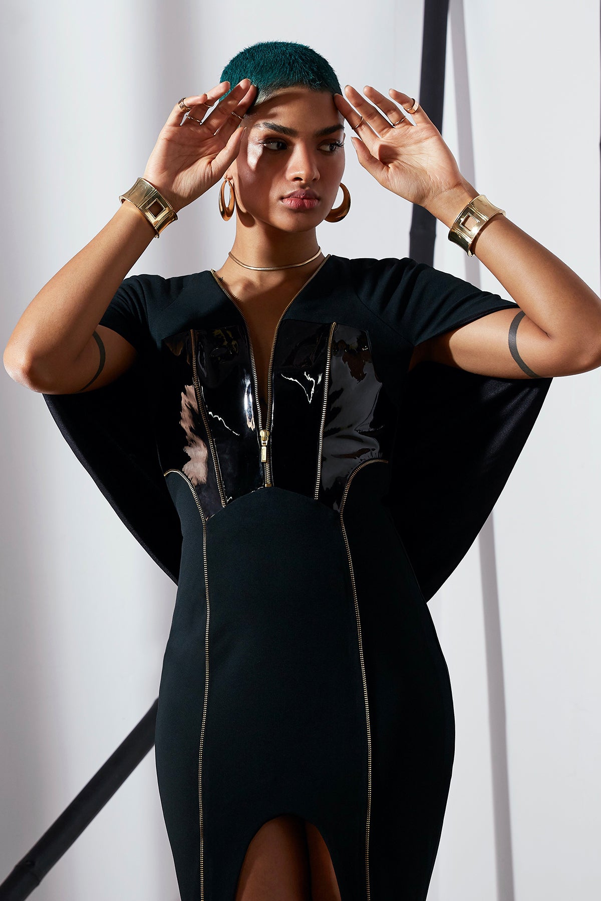 A cape-sleeve gown in stretch neoprene-twill, with faux-leather harness detail intertwined with signature gold hardware.