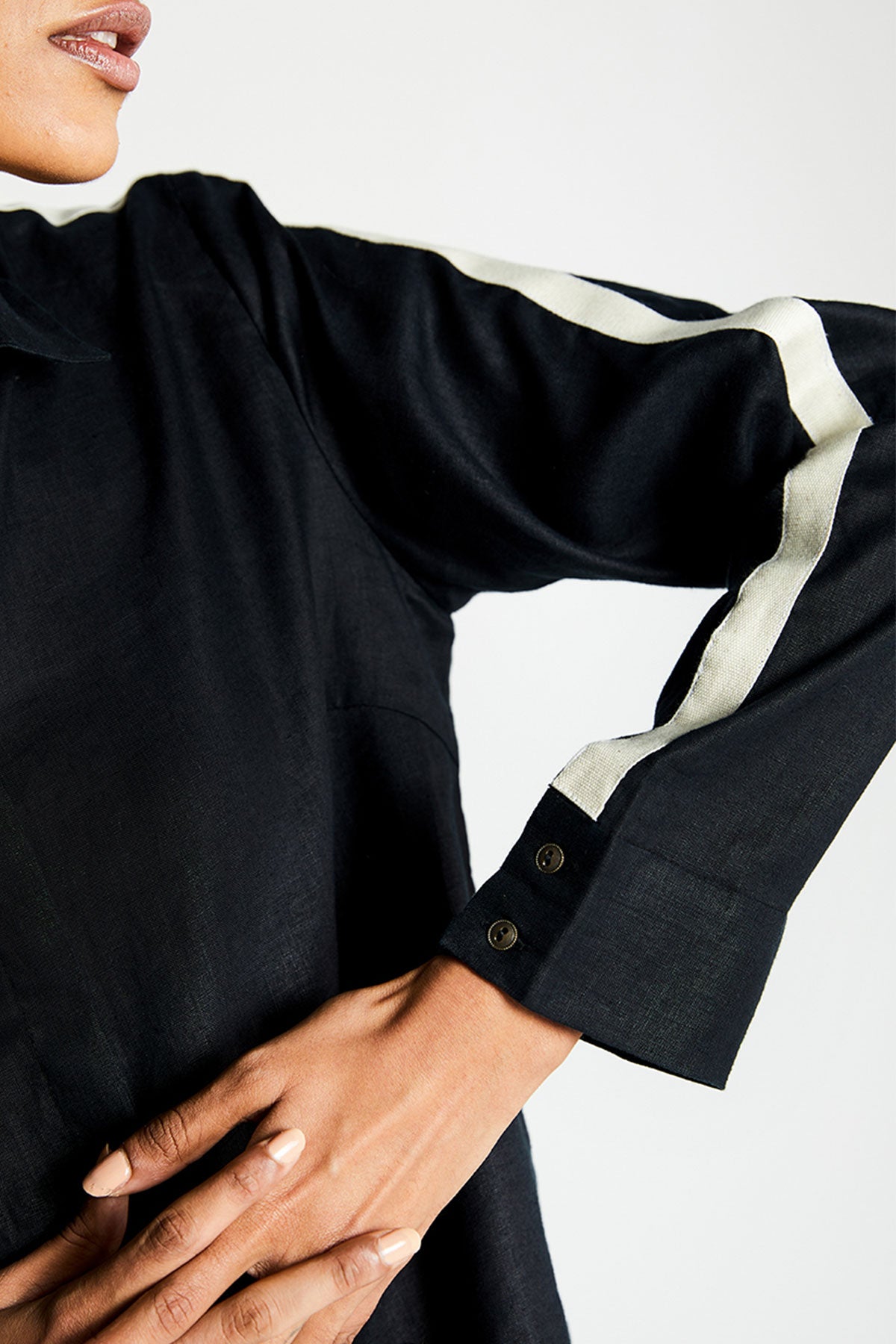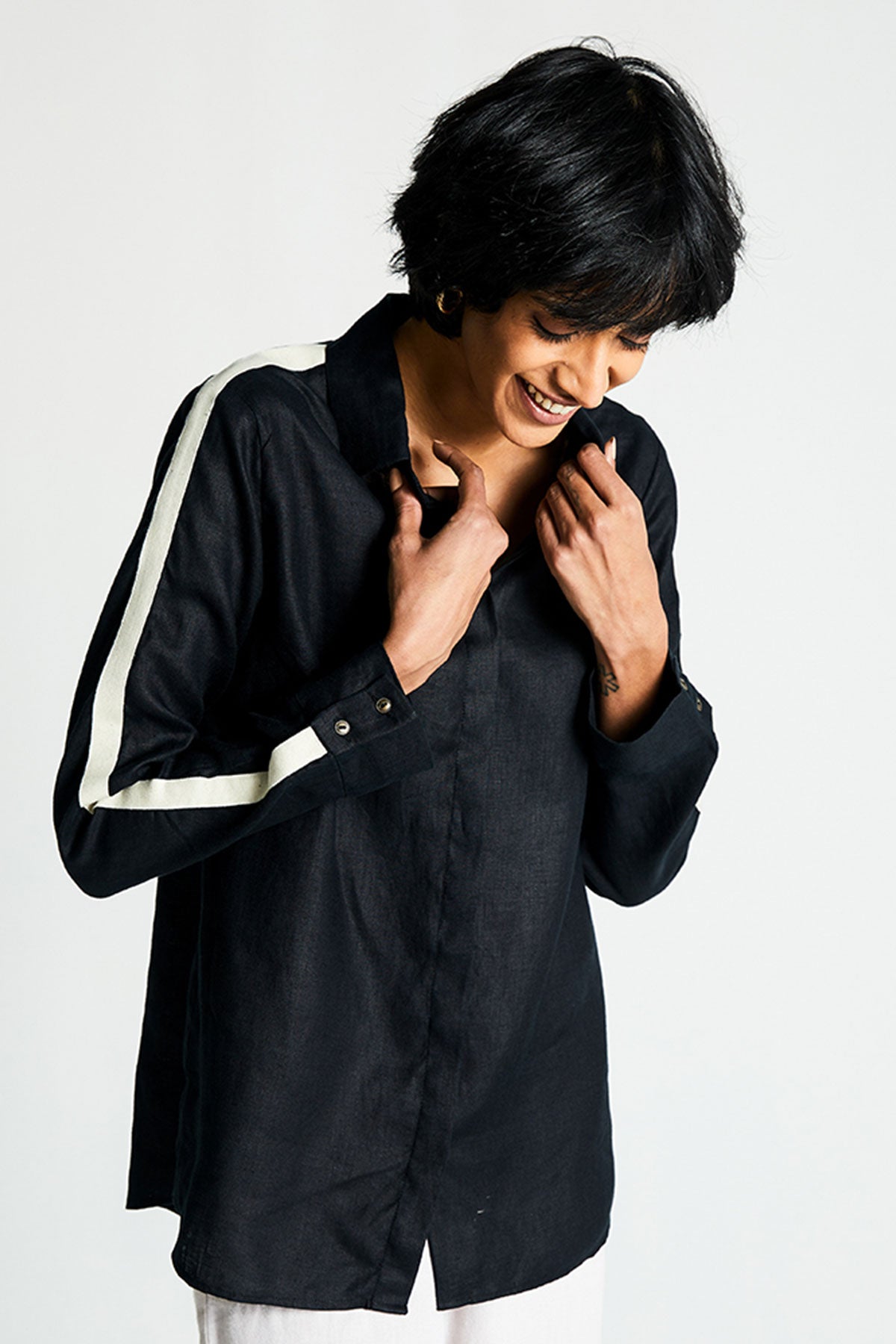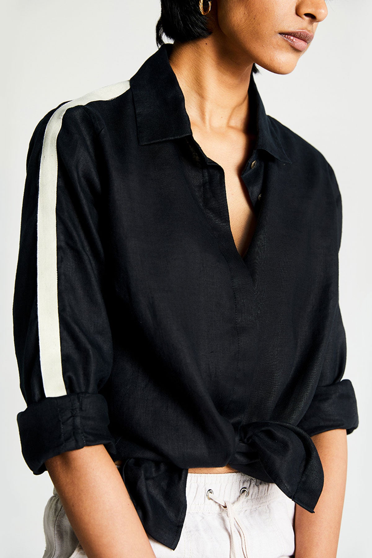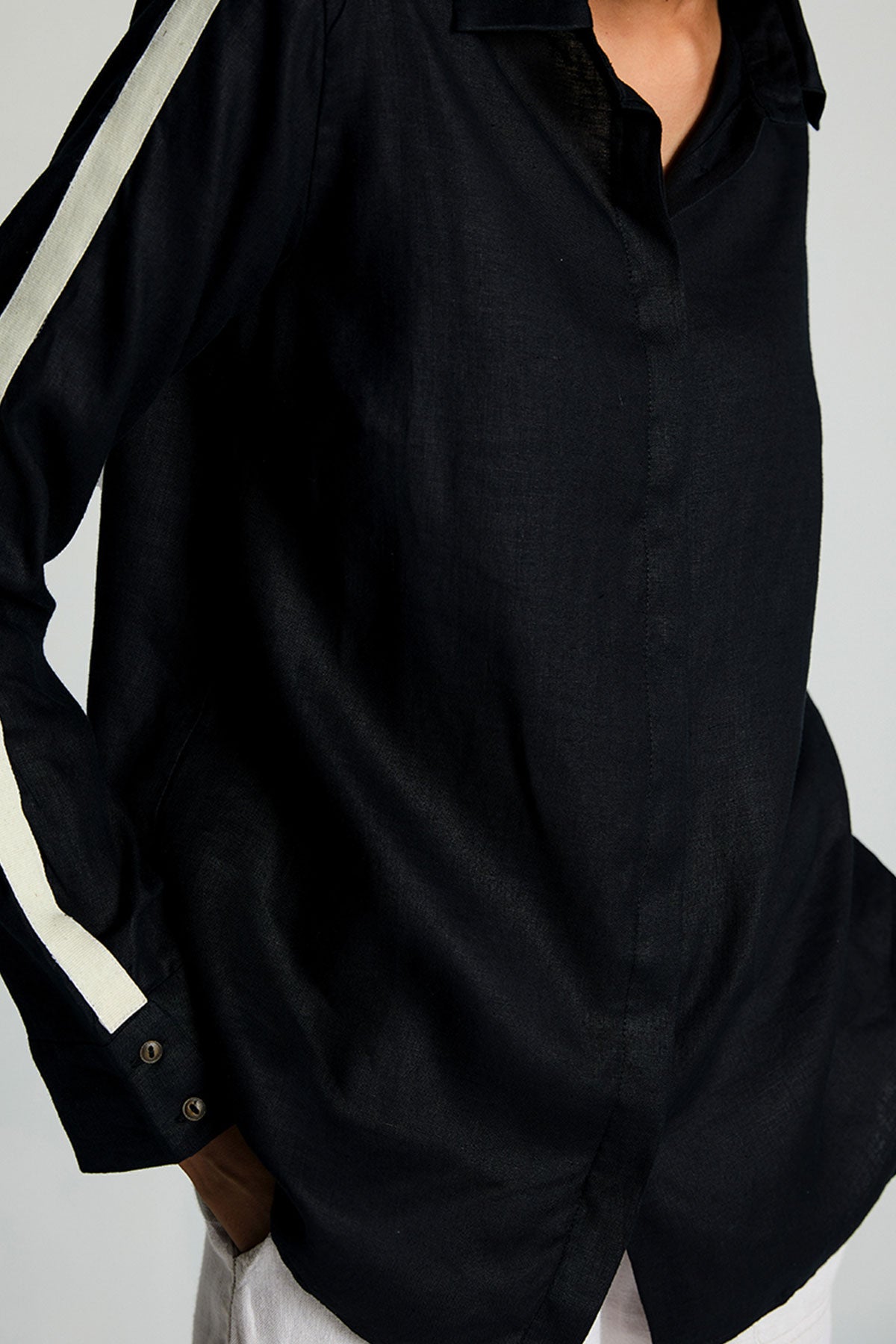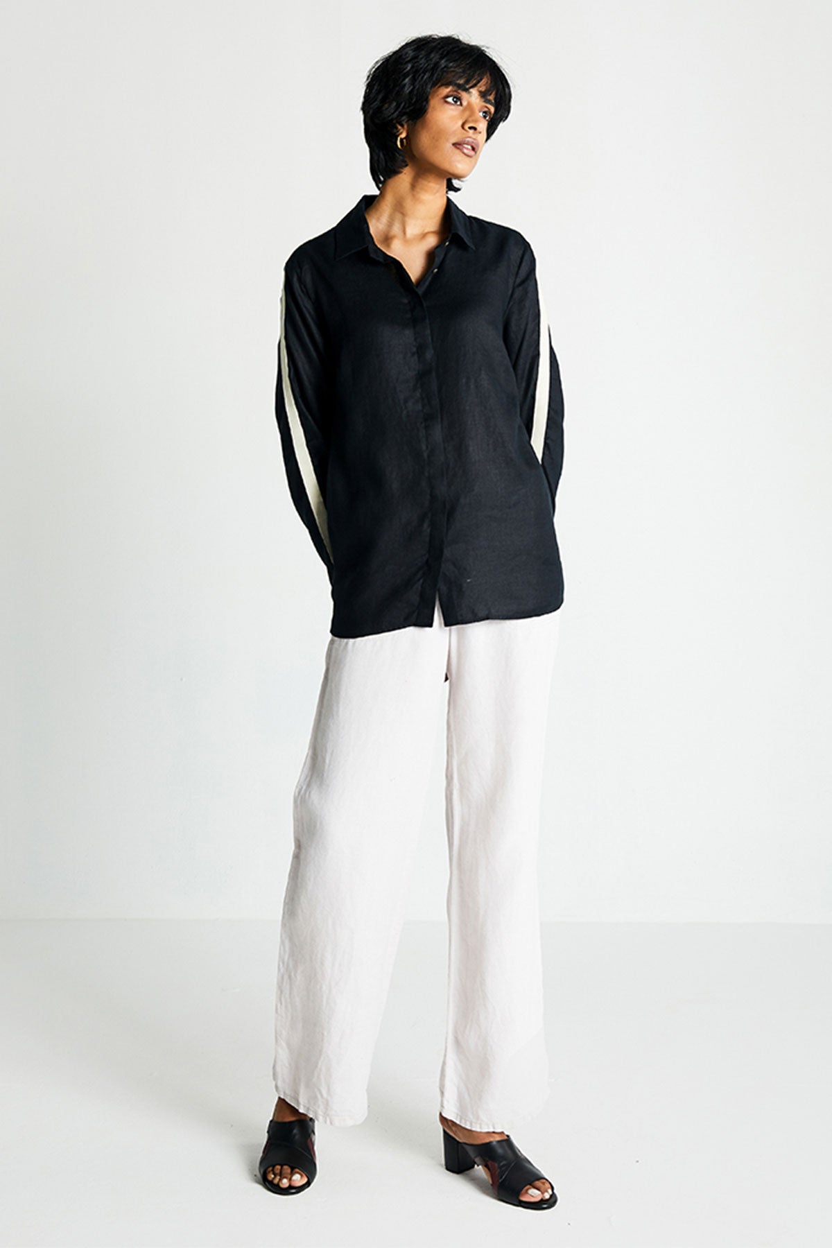 A classic, everyday shirt reimagined in 100% hemp. This timeless piece features a color blocked stripe on the sleeves for added flair.