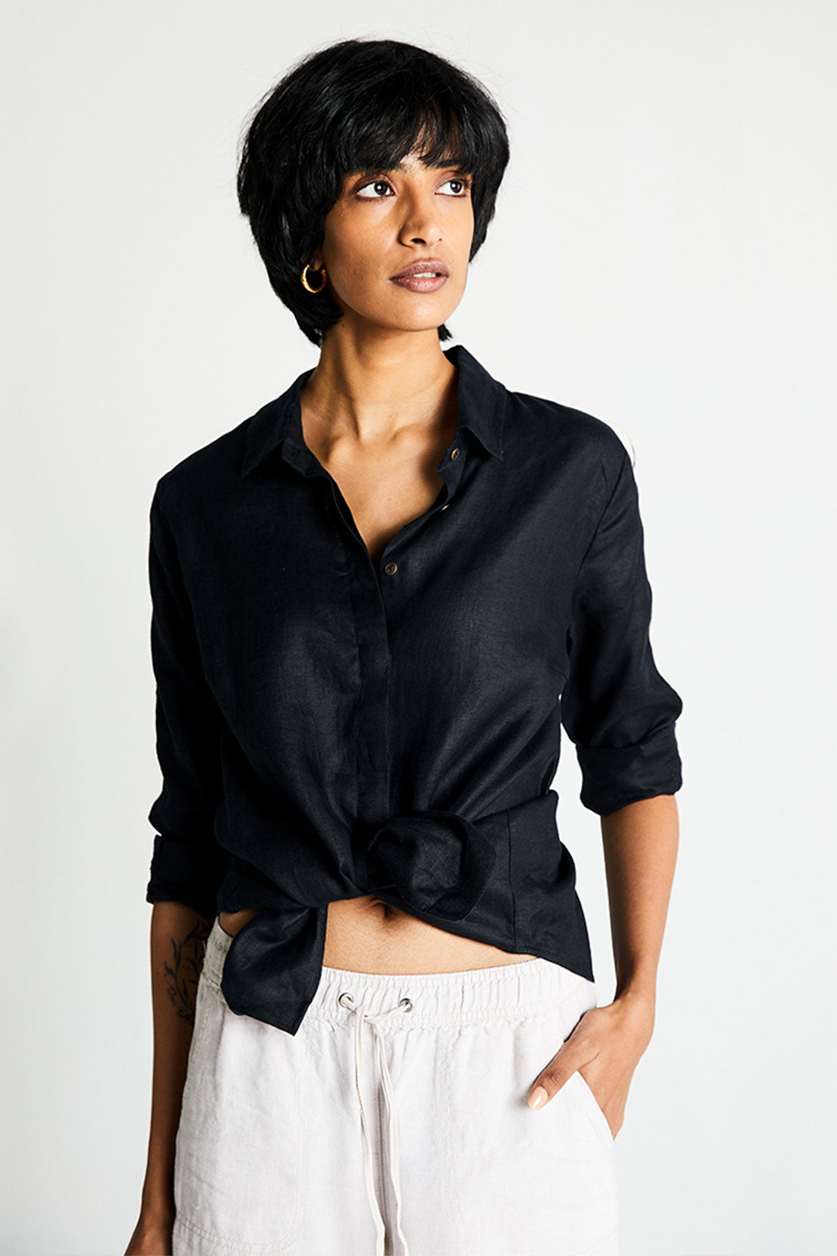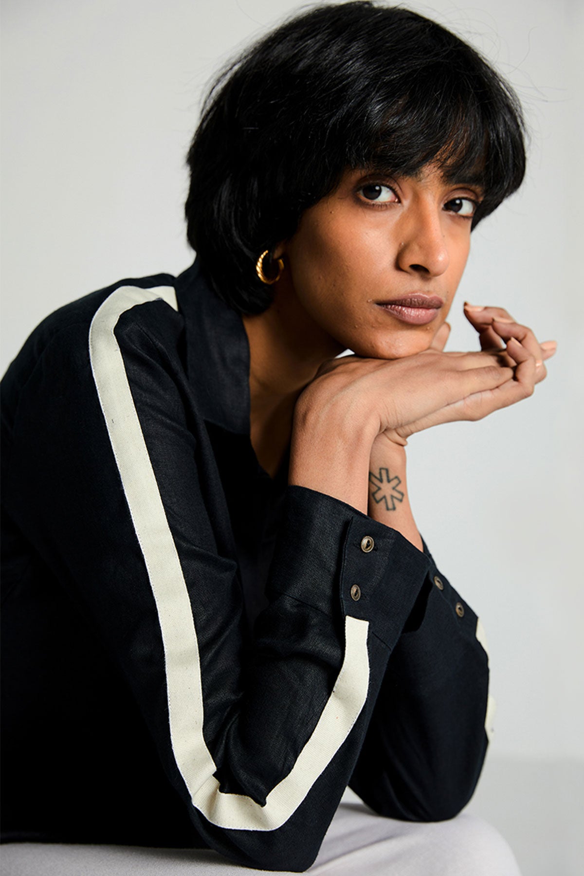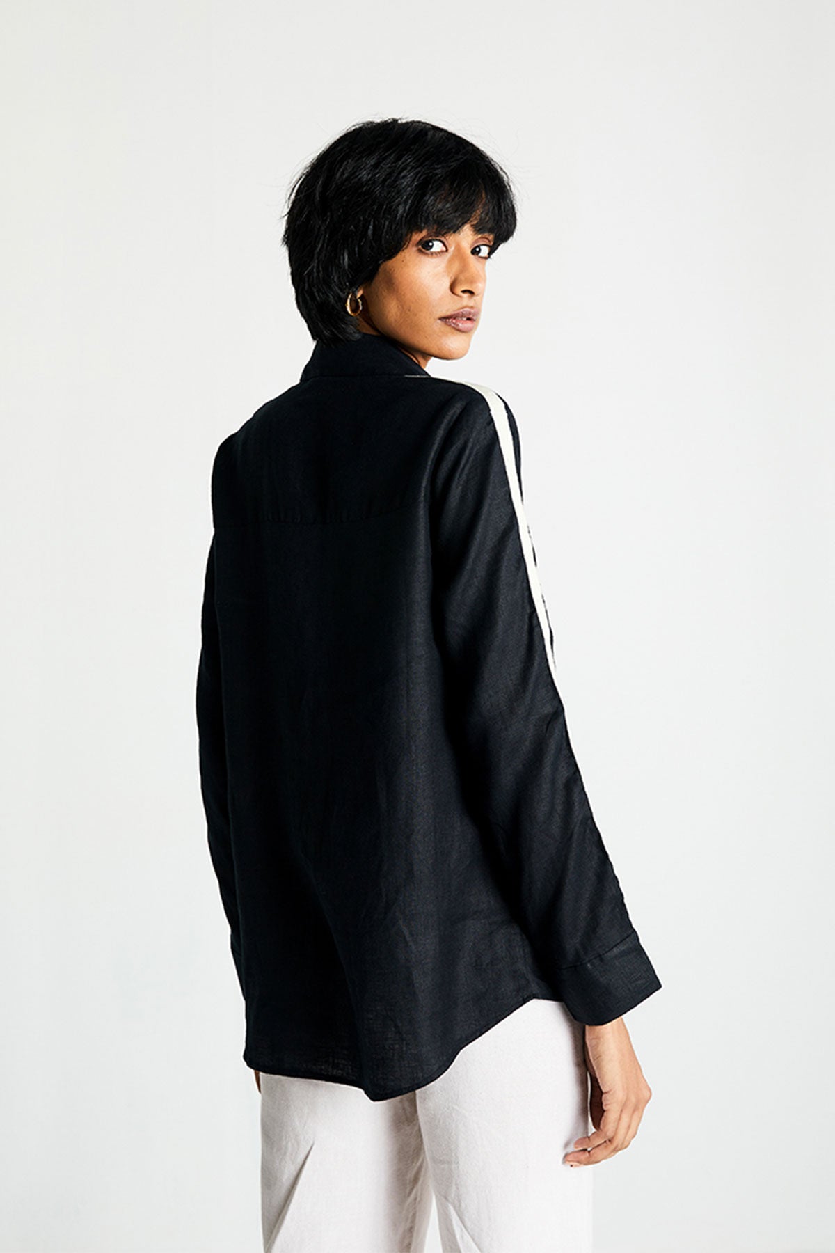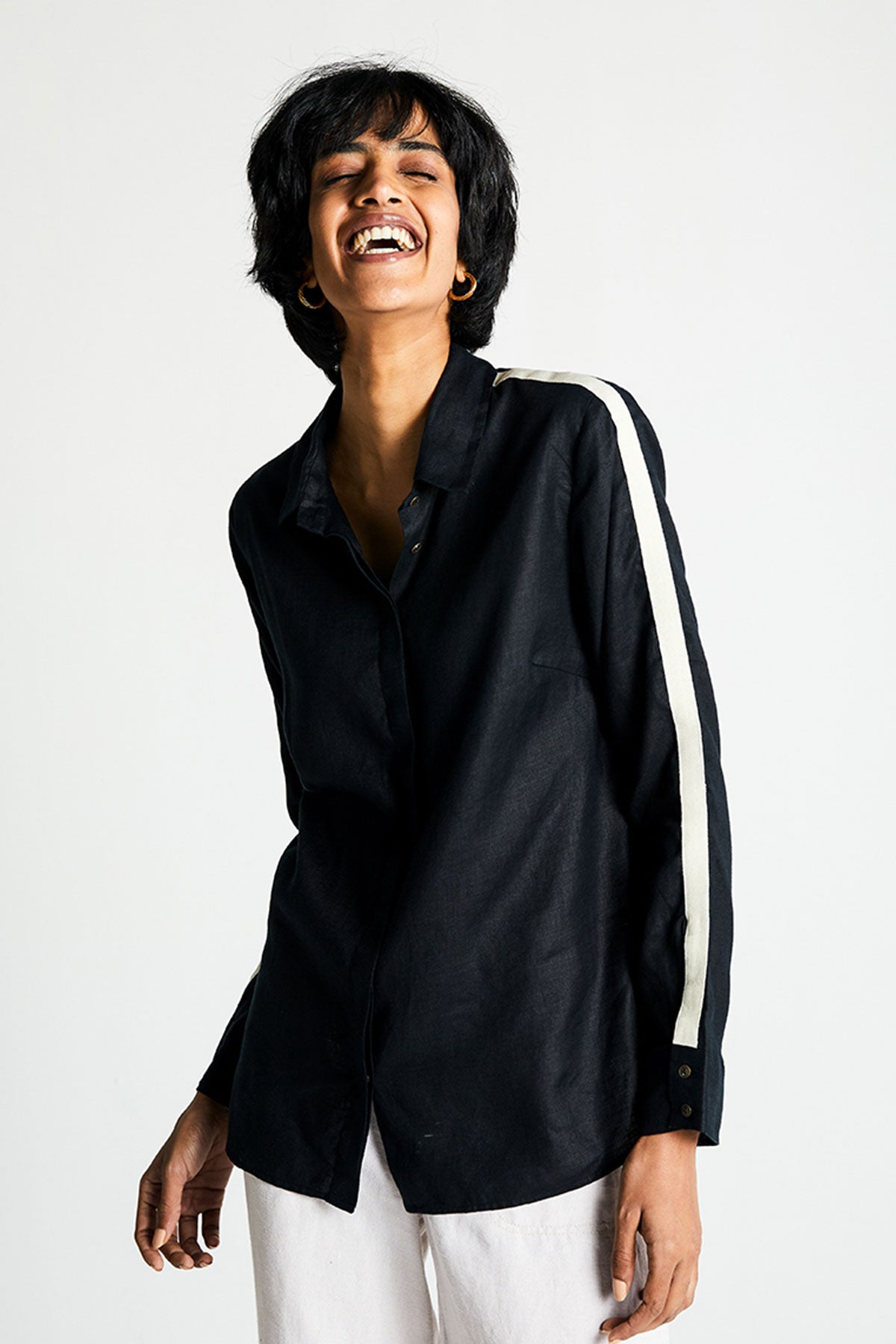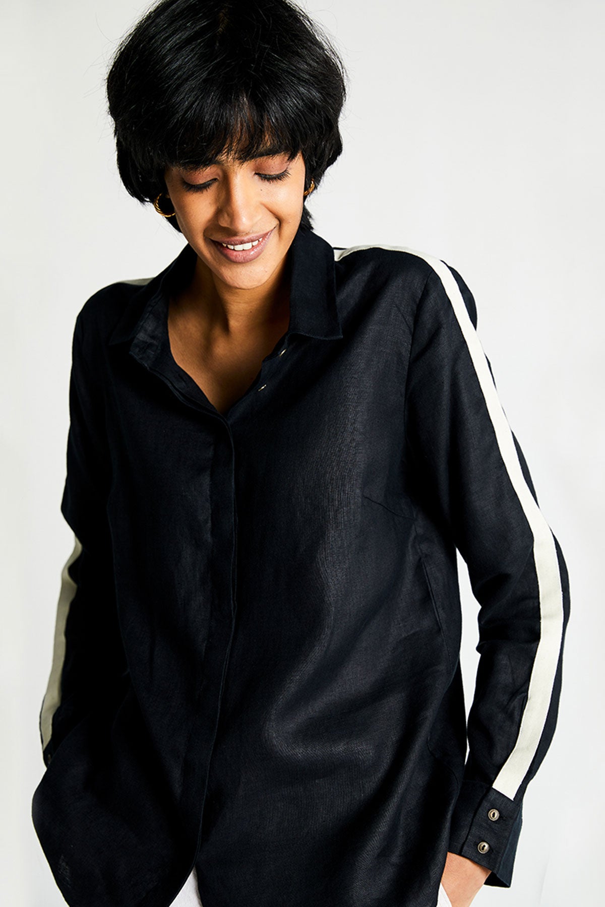 A classic, everyday shirt reimagined in 100% hemp. This timeless piece features a color blocked stripe on the sleeves for added flair.