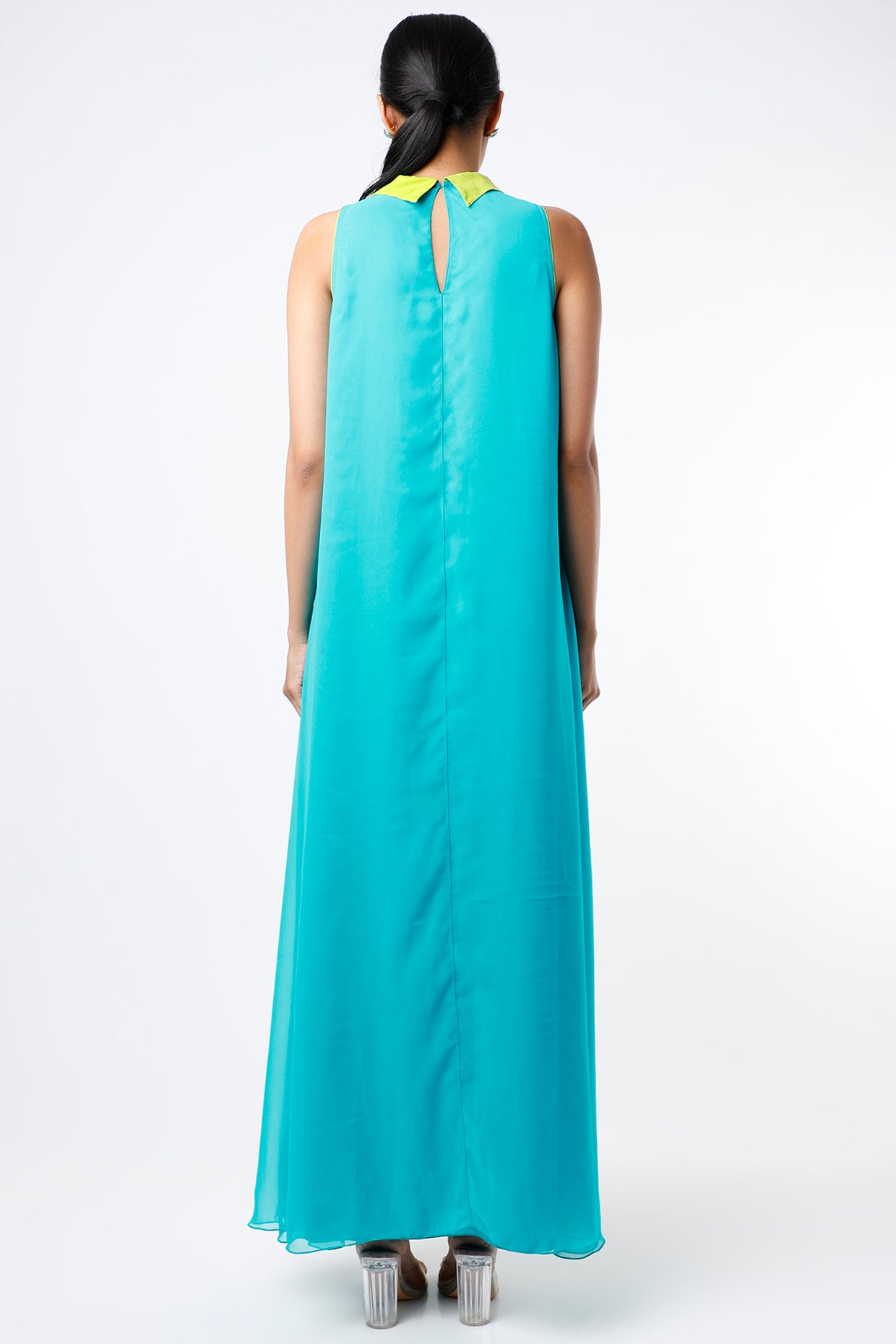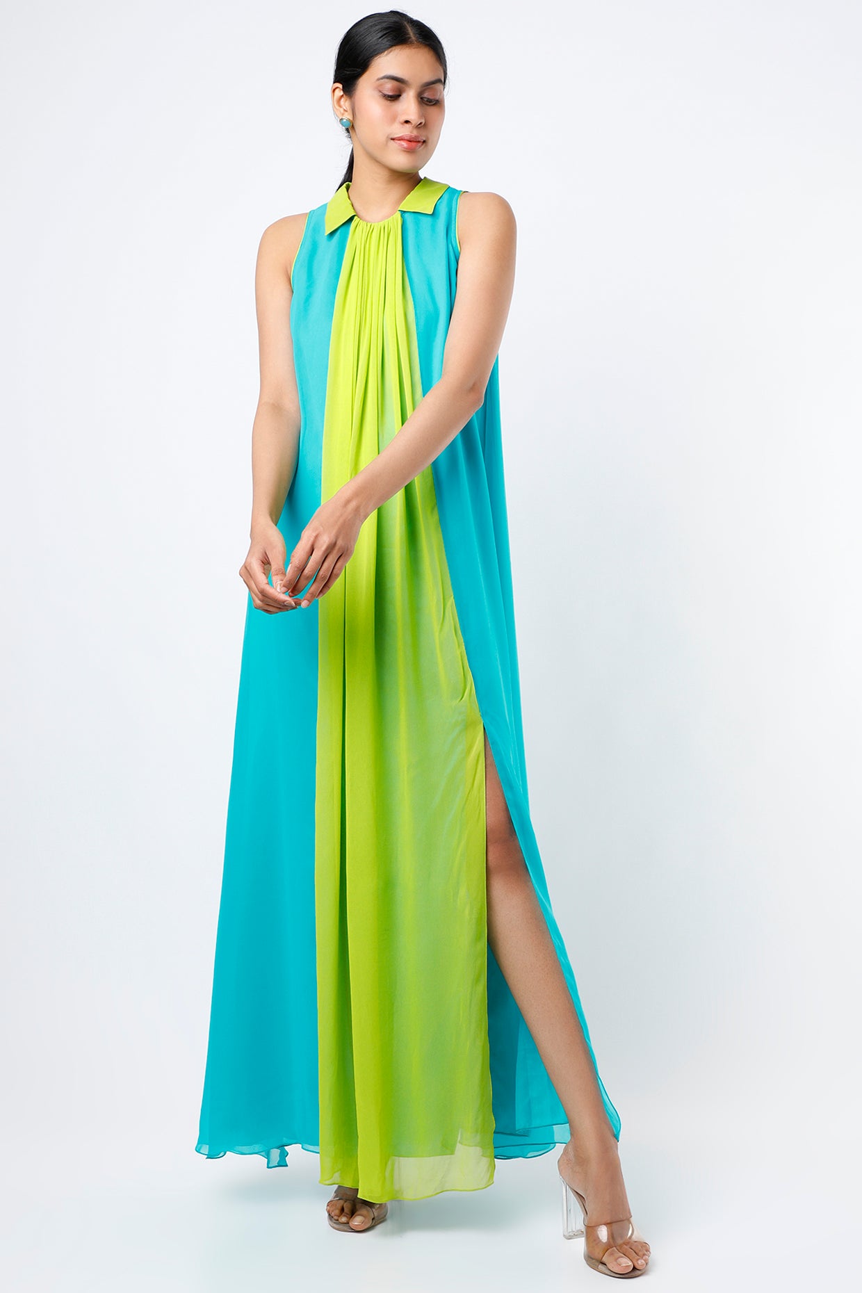 Featuring a turquoise and Neon Green sleeveless maxi dress in georgette base with a slit.