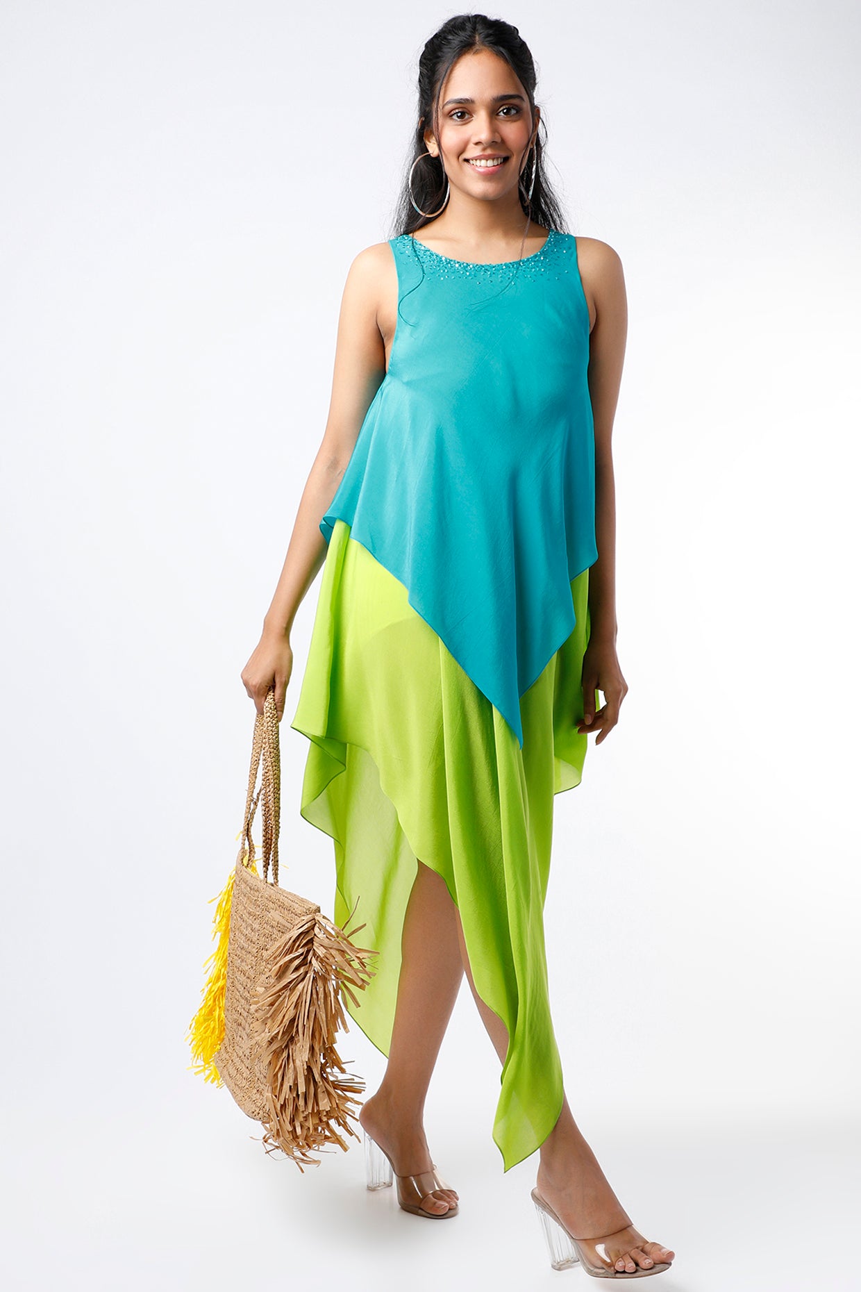 Featuring a turquoise and Neon green layered dress in crepe base with handkerchief hem and sequins embroidery.