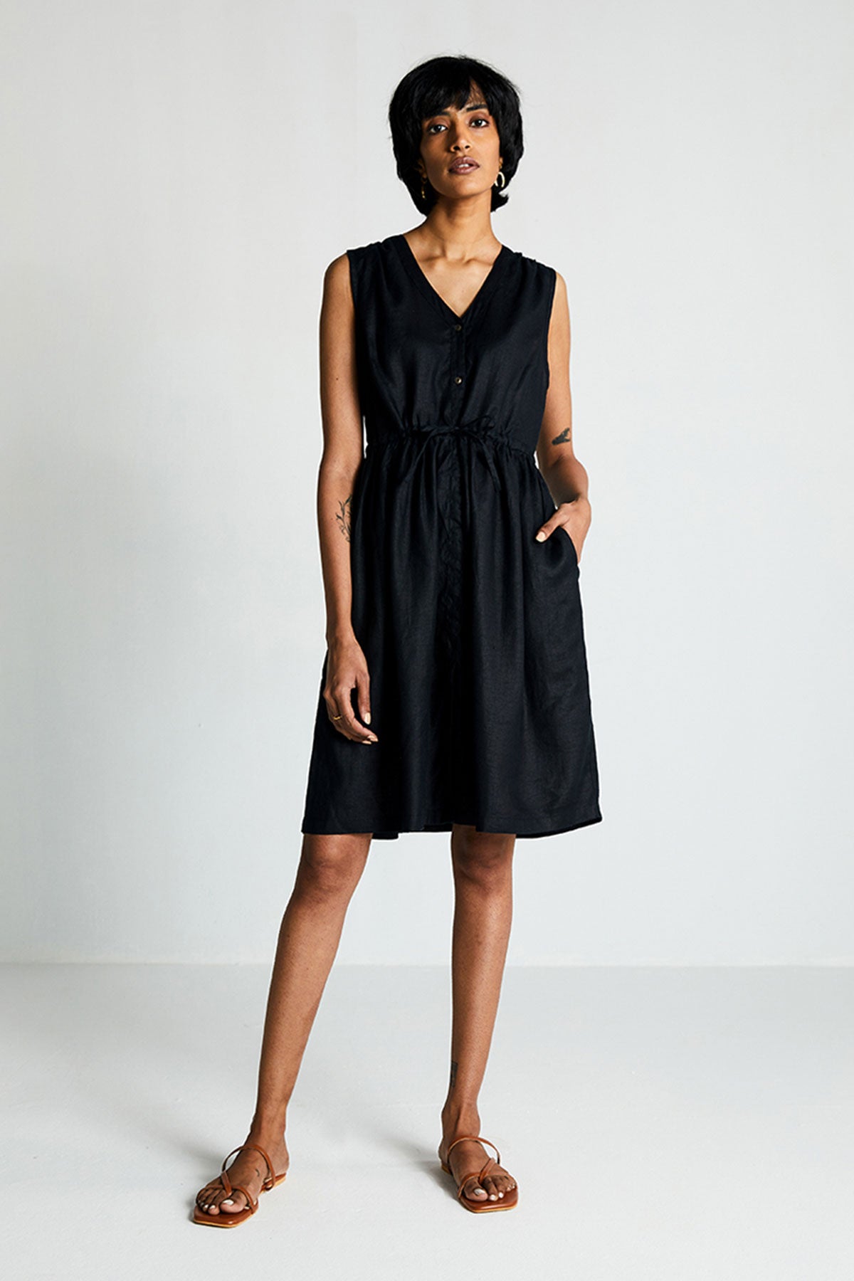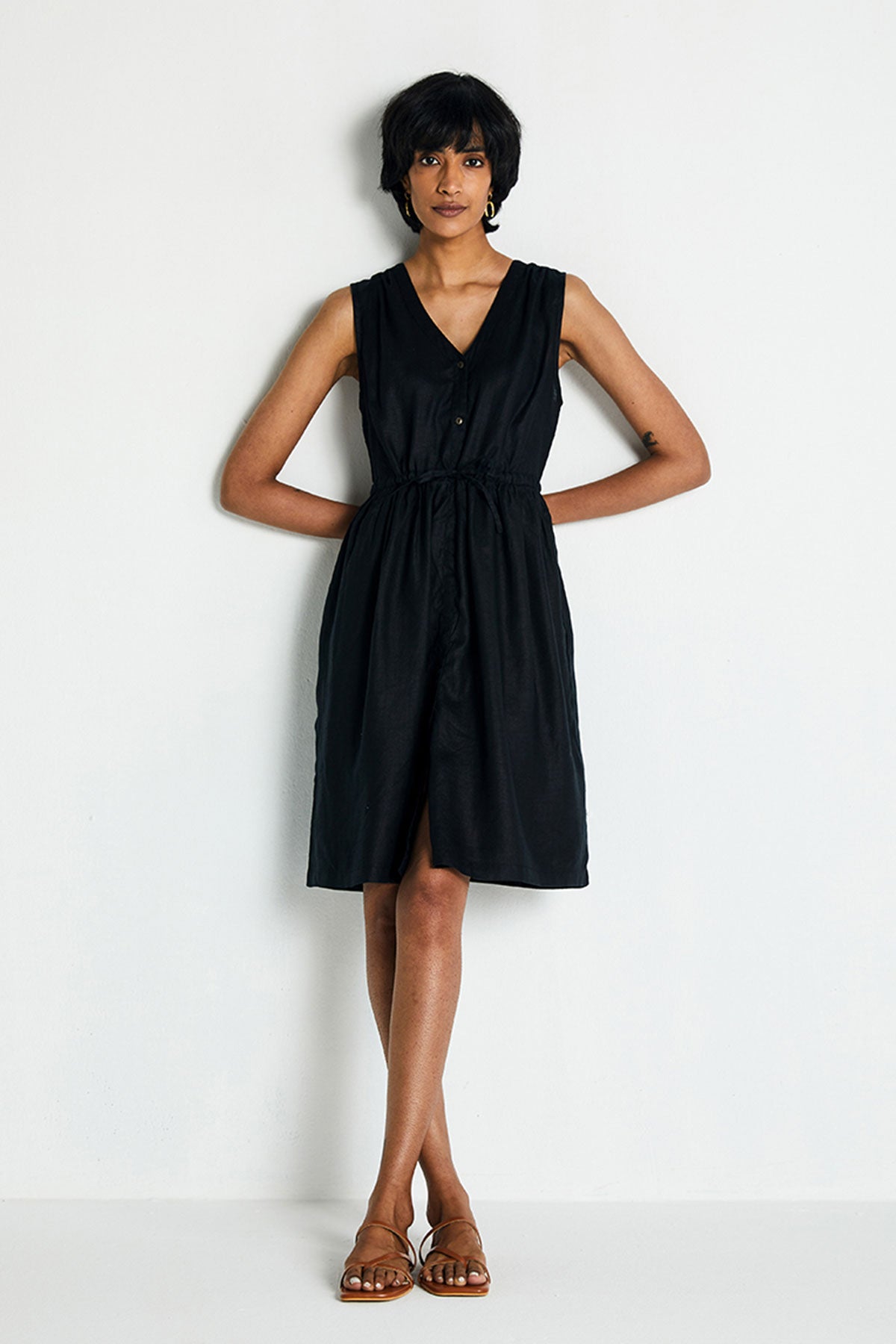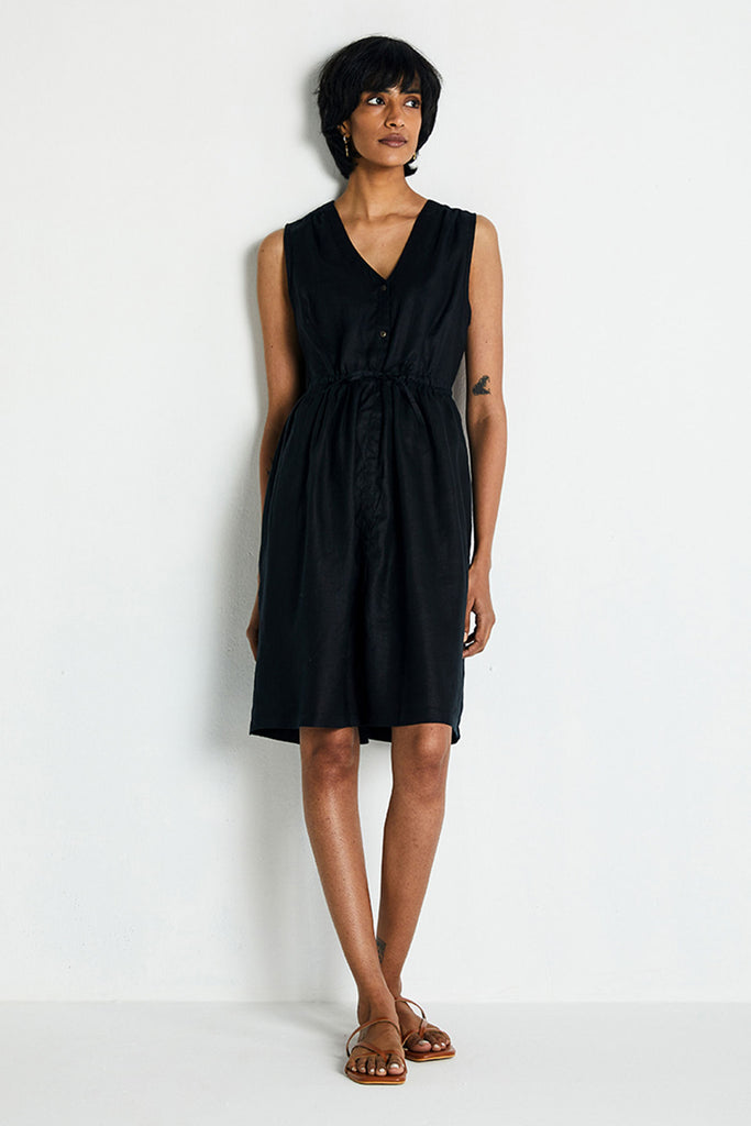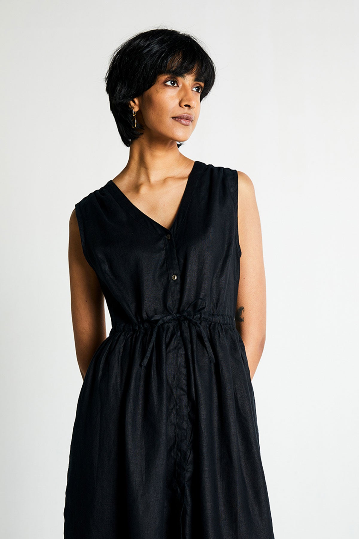 With a relaxed V-neck, this drawstring dress can be cinched at the waist to suit your comfort. Hidden in-seam side pockets make it more functional.