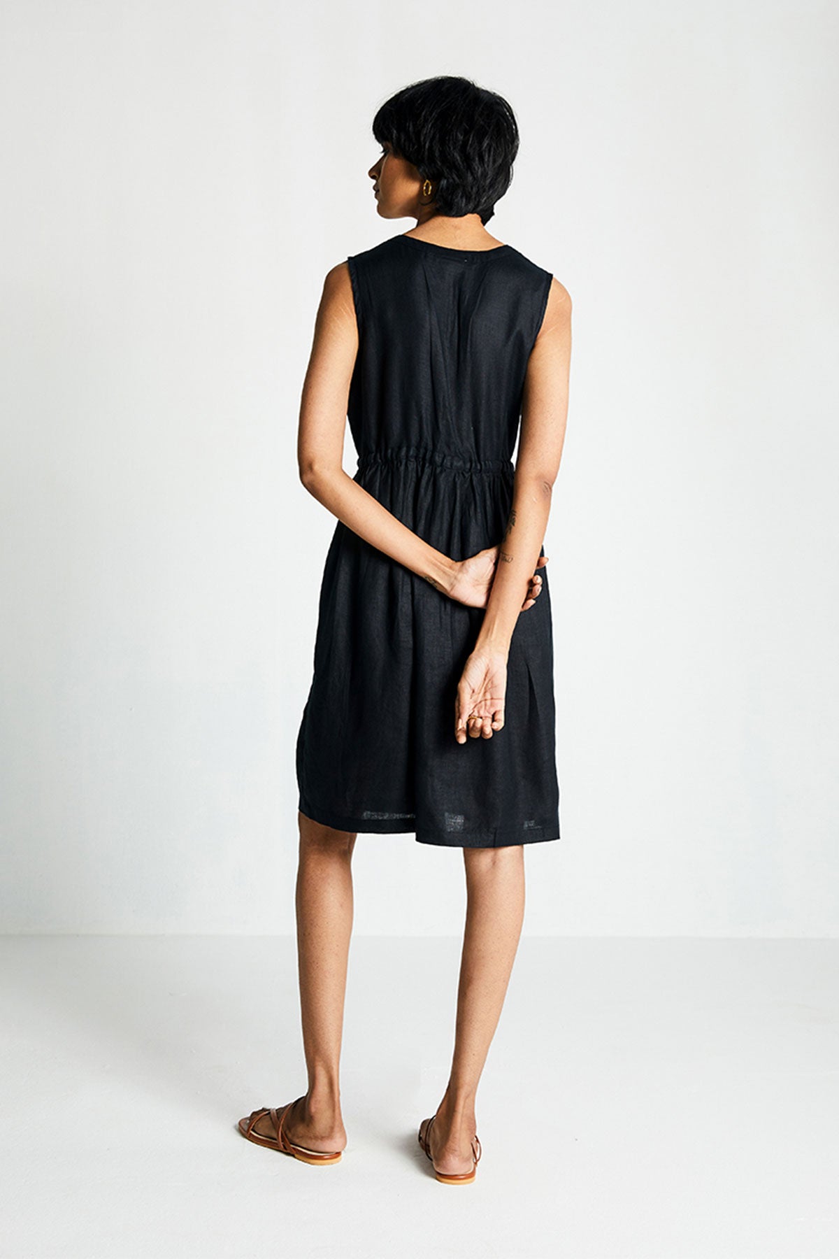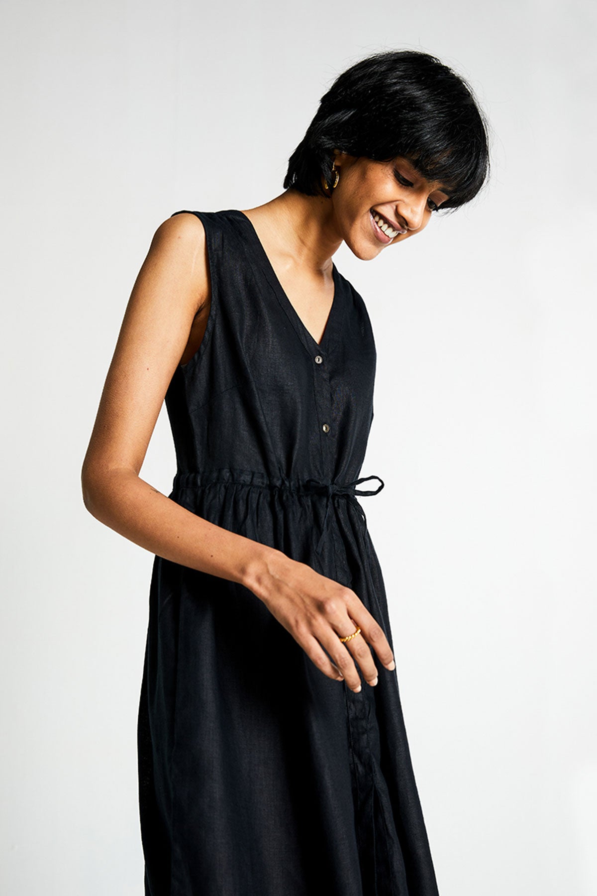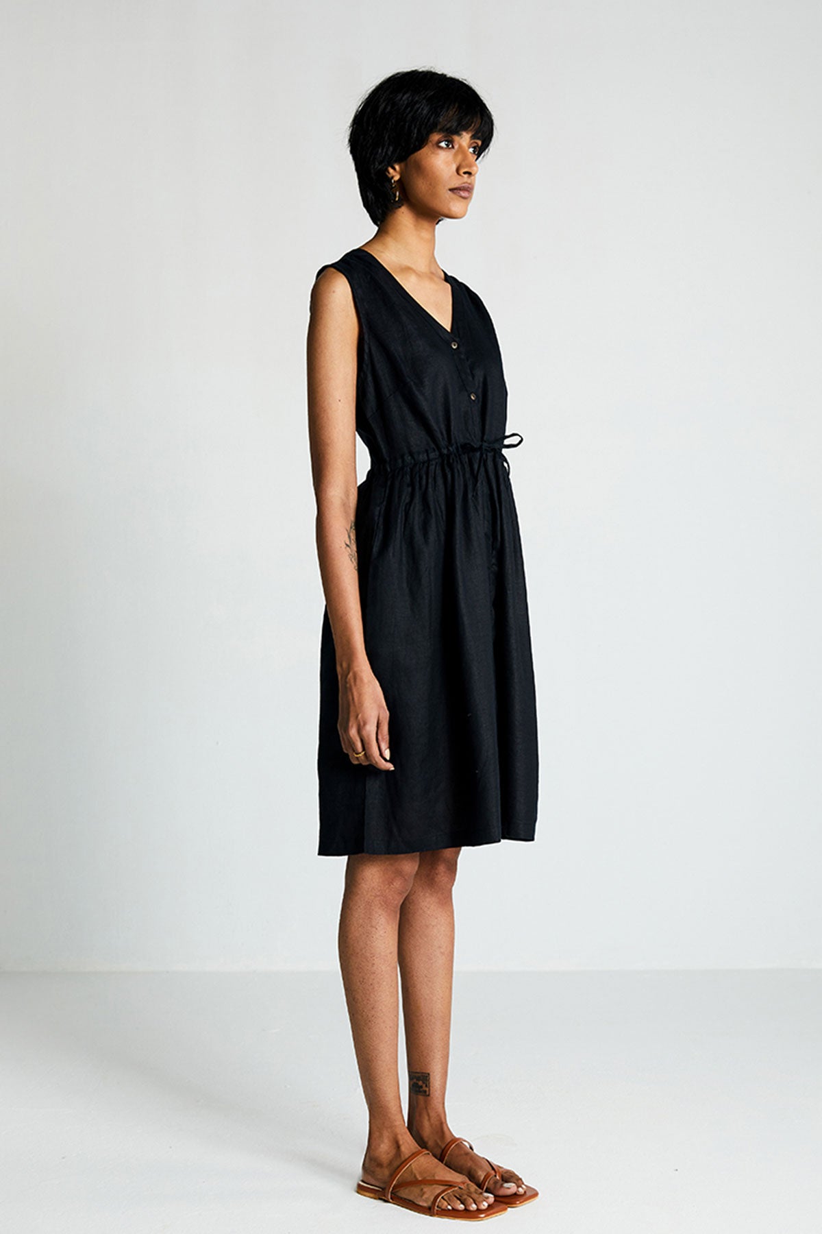 With a relaxed V-neck, this drawstring dress can be cinched at the waist to suit your comfort. Hidden in-seam side pockets make it more functional.