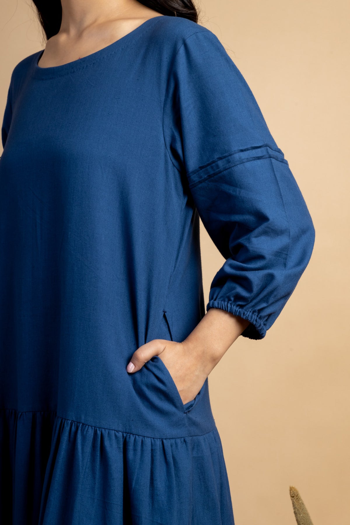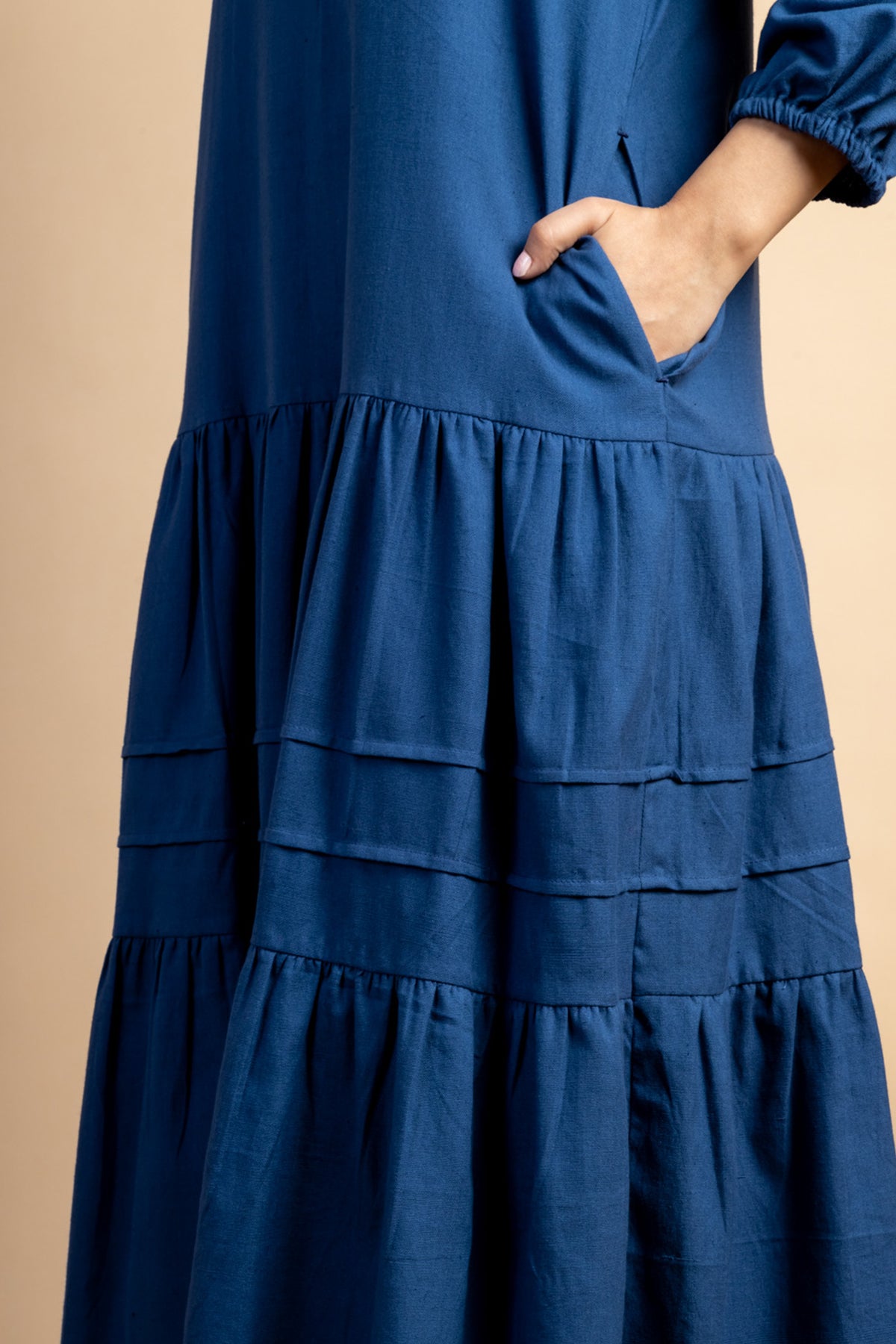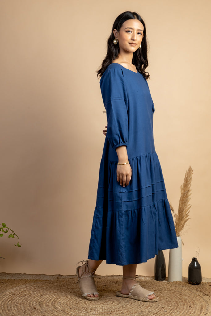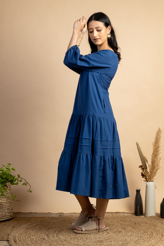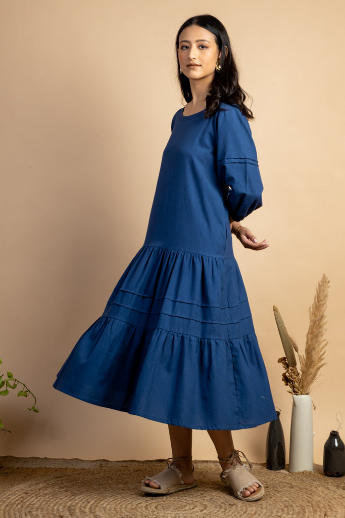 Look like a diva in this simple Navy colour Tiered Dress featuring slightly puff sleeves and pintuck detail. This piece is made in handwoven cotton fabric and comes with side pockets attached.