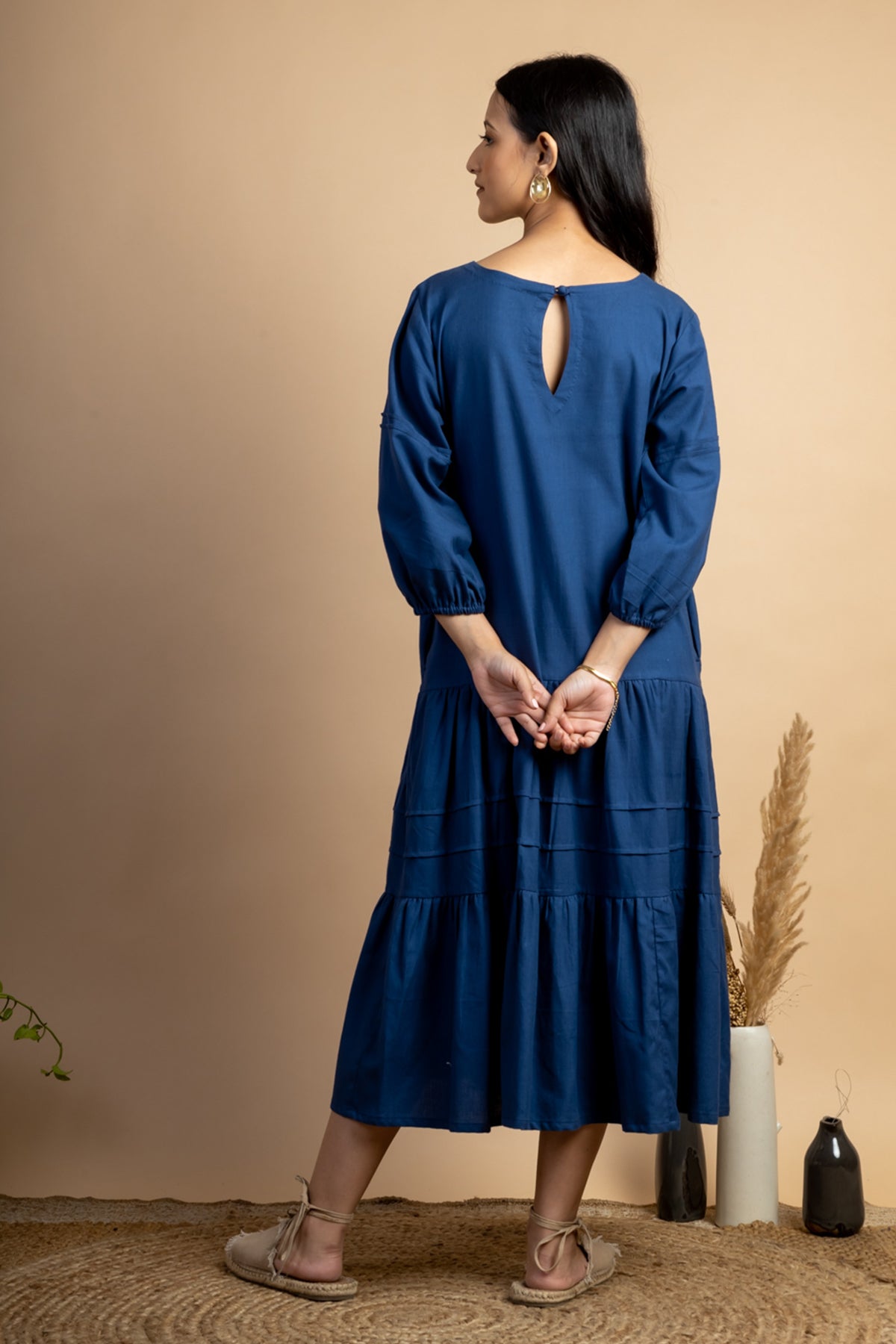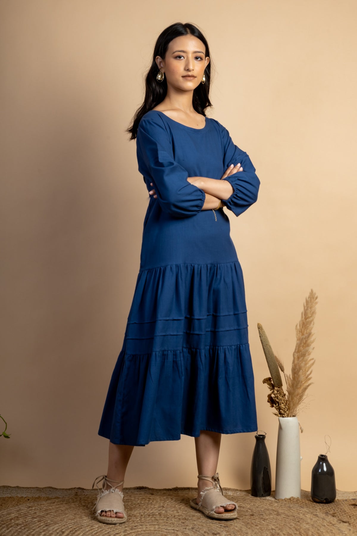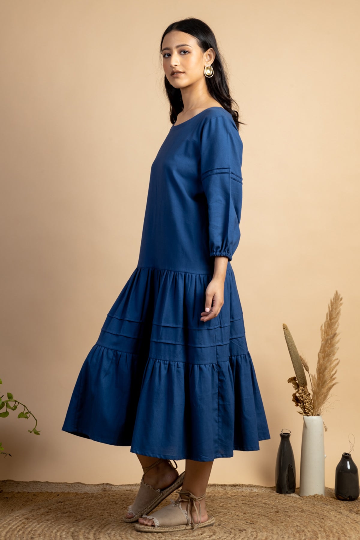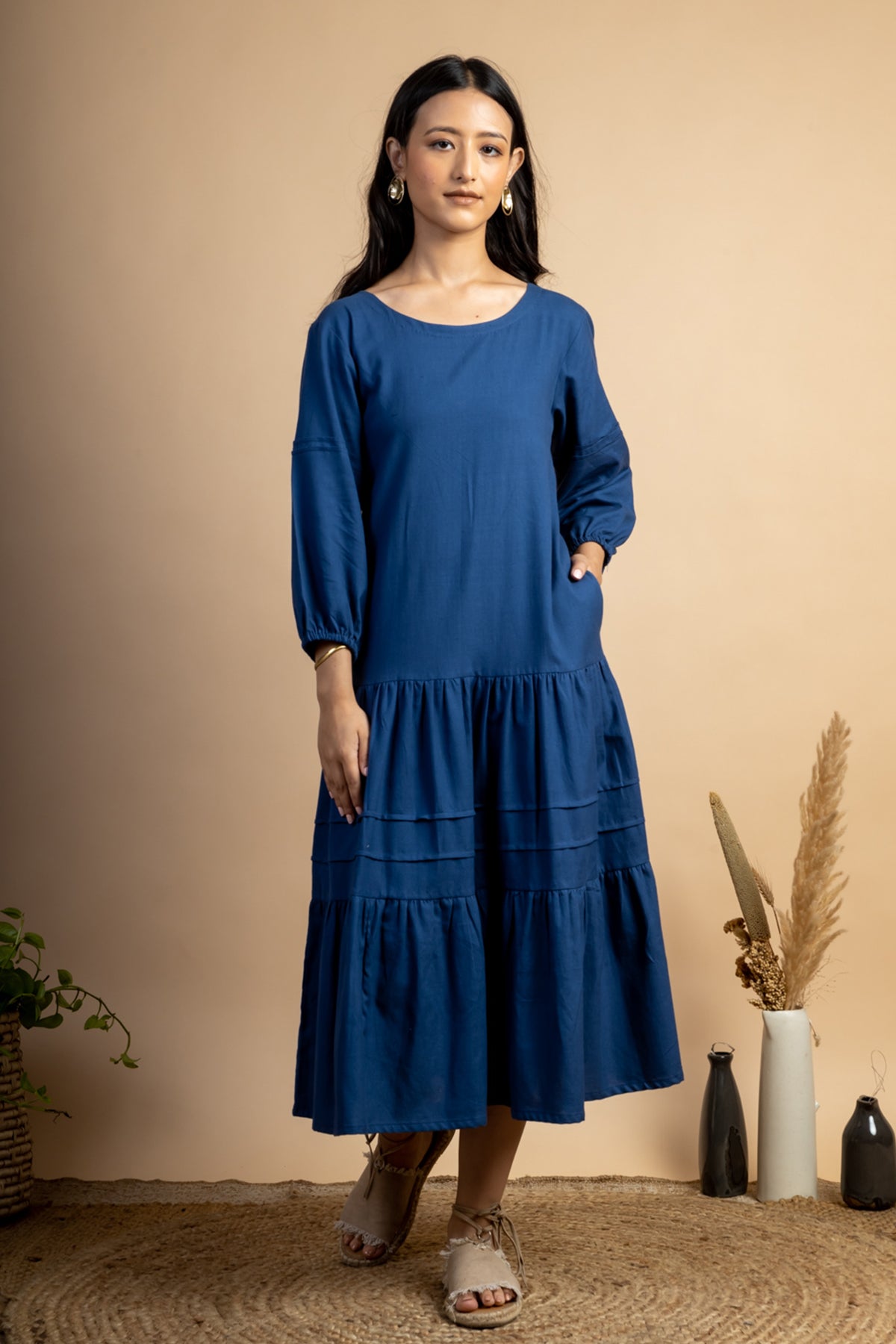 Look like a diva in this simple Navy colour Tiered Dress featuring slightly puff sleeves and pintuck detail. This piece is made in handwoven cotton fabric and comes with side pockets attached.