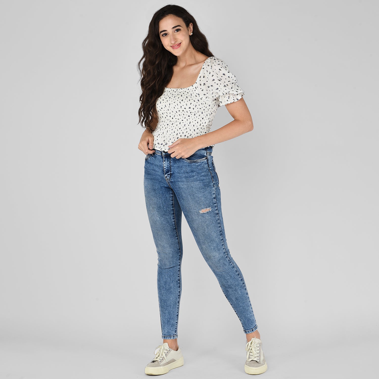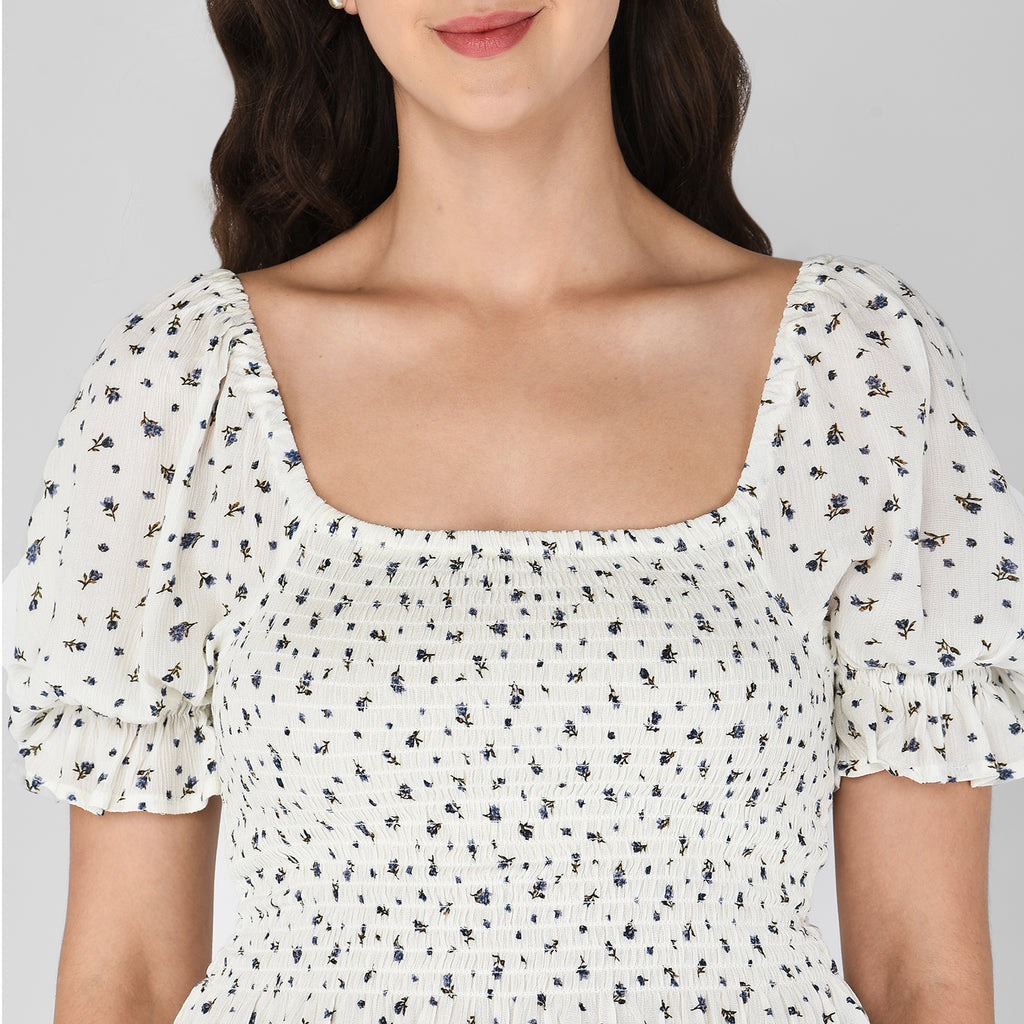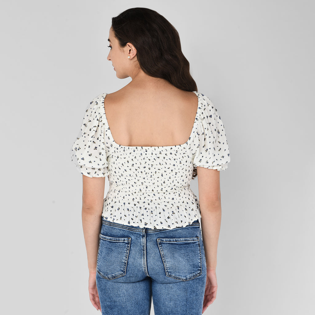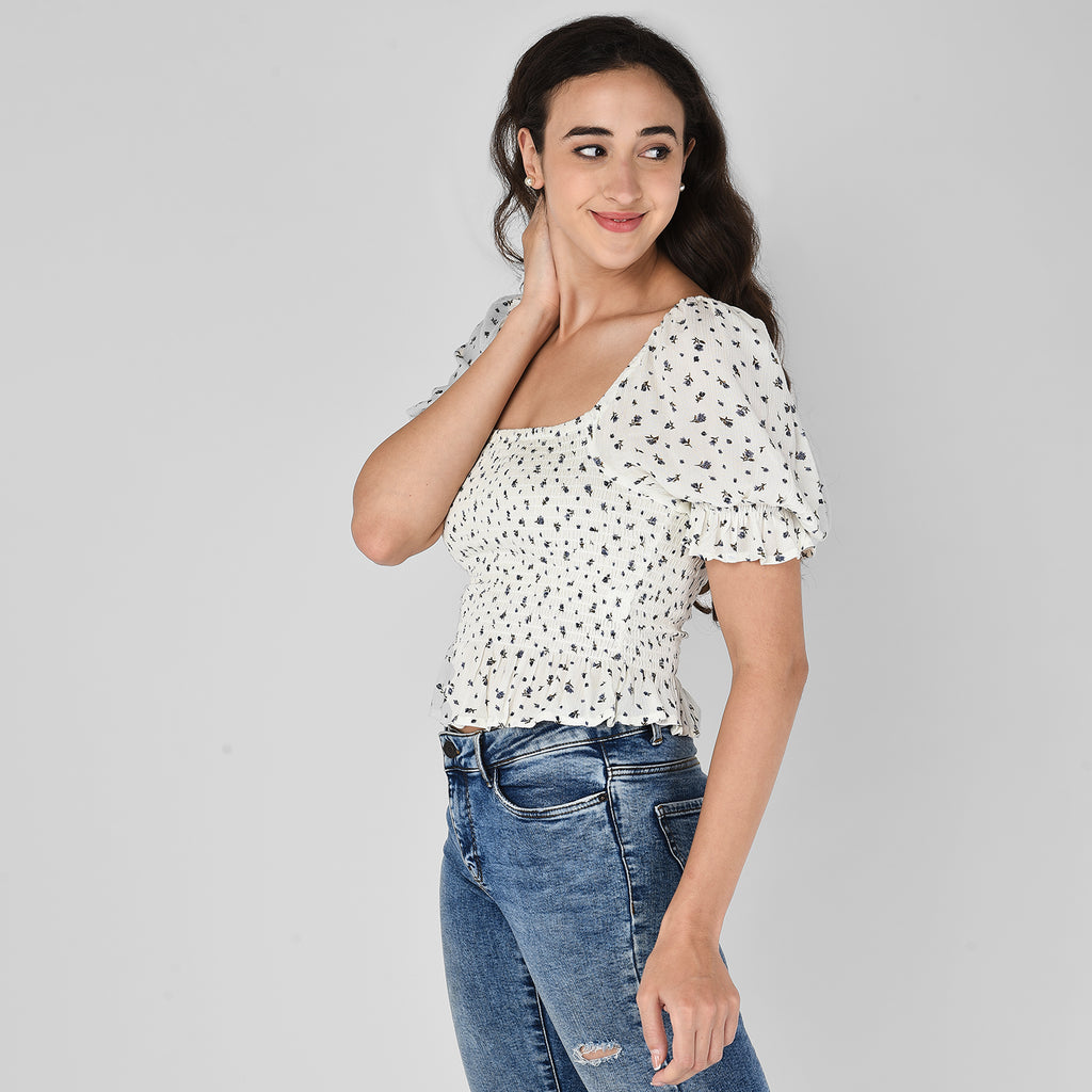 Smocking hot! This romantic smocked top is an elegant addition to your collection. Crafted in rayon, this stunning piece features a flattering a square neckline and is completed with short puff sleeves with elasticated cuffs, rendering it comfortable for long hours. Style this top with blue denim and a sling bag for a casual day look.