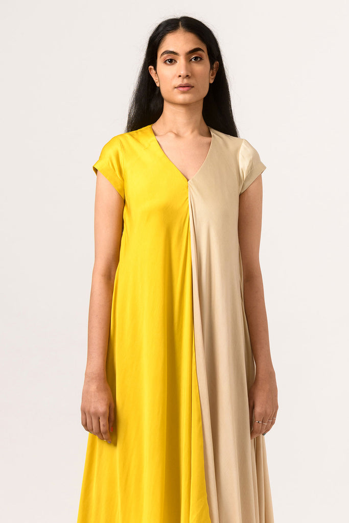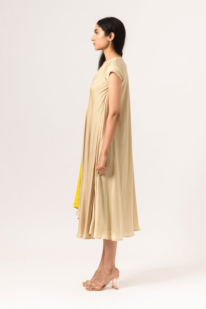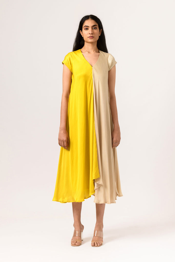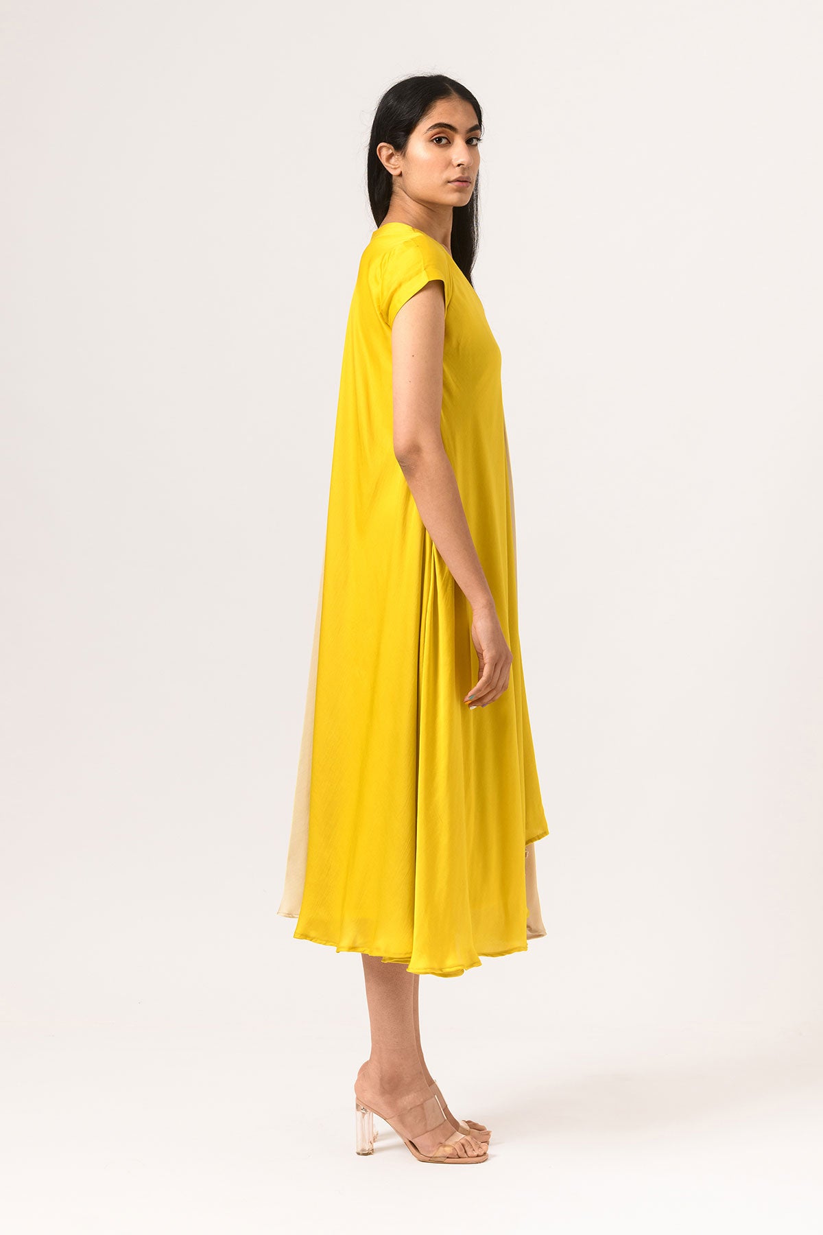 Yellow-Ecru Cap Sleeves Midi Drape Dress.Length of the Garments: 49