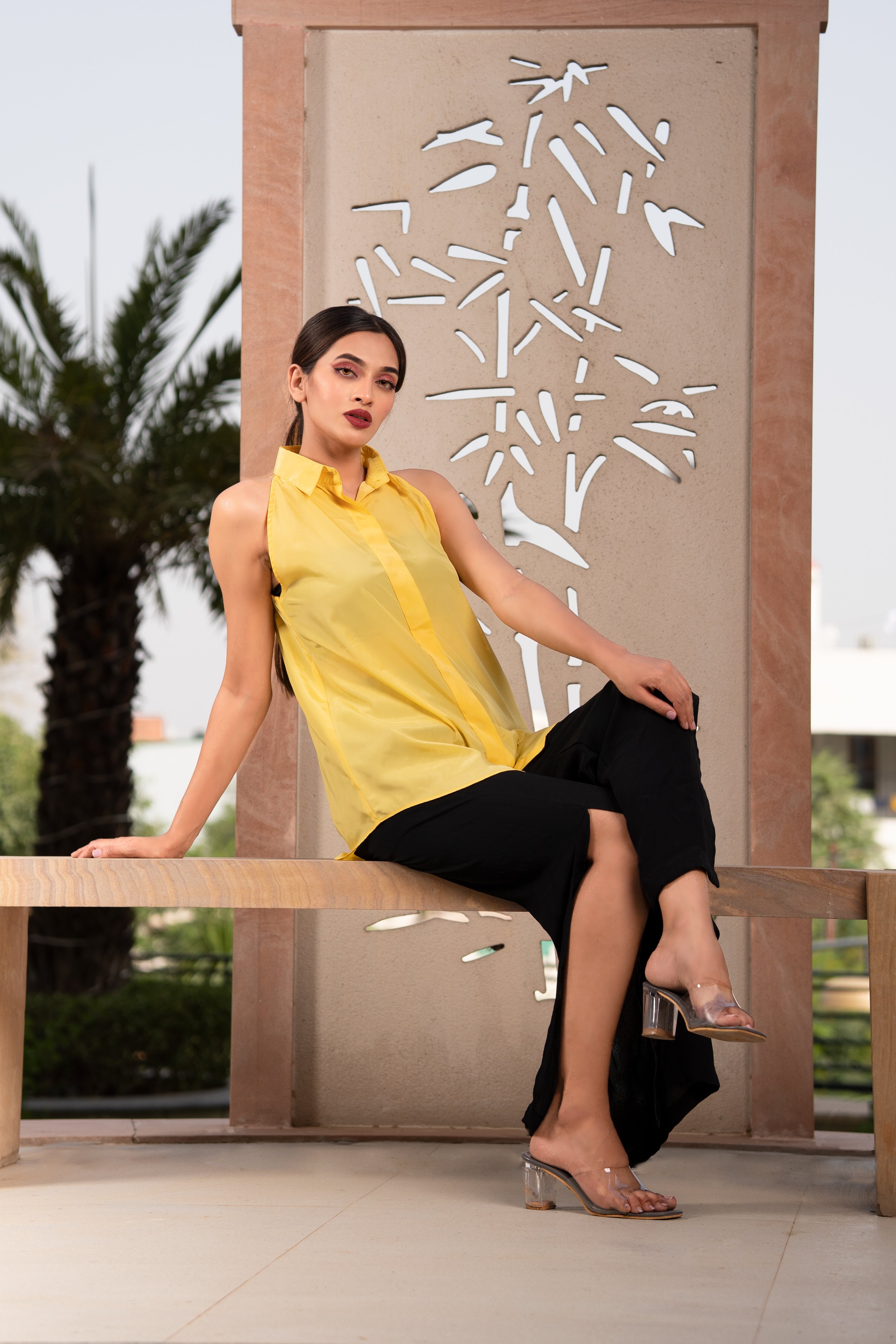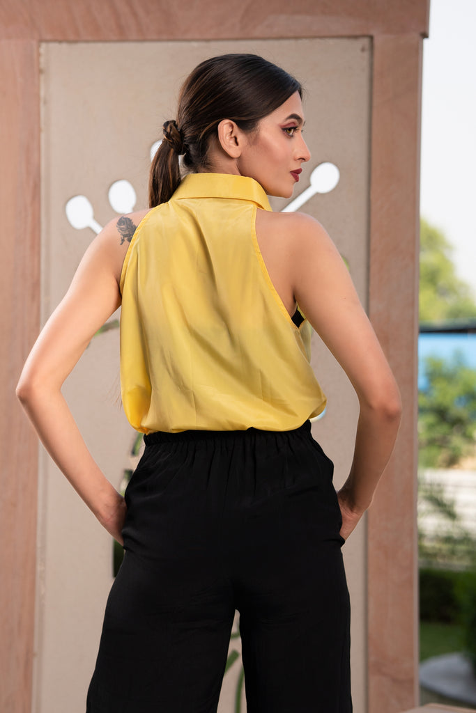 Featuring bright yellow self-design halter shirt, it has a spread collar, concealed button placket and curved hem.