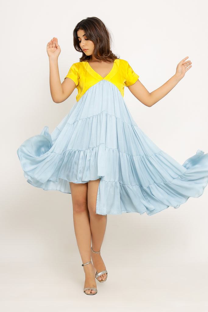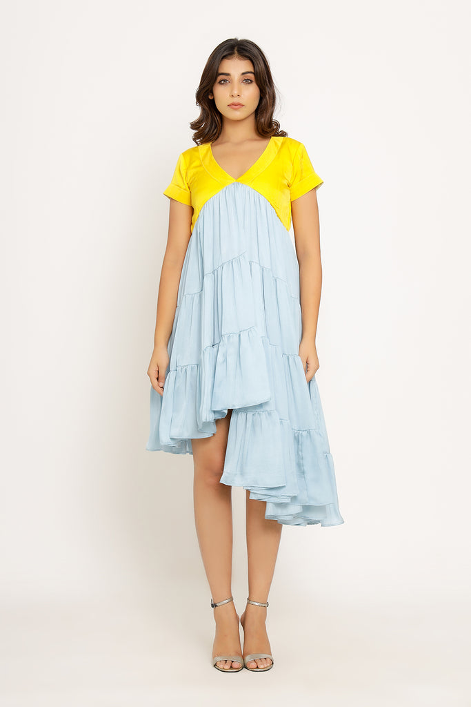 Yellow-Ice Blue Color Blocked Asymmetrical Dress