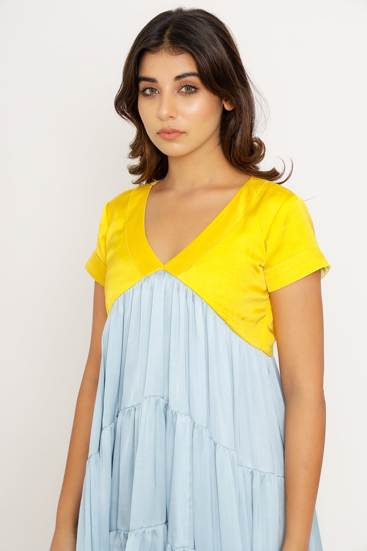Yellow-Ice Blue Mid Length Dress with Gathers and an Asymmetrical High Low Pattern.
