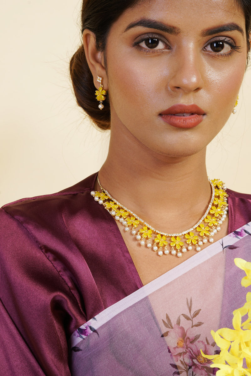 This jewellery set consists of a Necklace & a pair of Earrings. Gold Plated Silver Toned Classic Kundan Jewellery Set, secured with drawstring closure. A pair of matching earrings each secured with post and back closure.