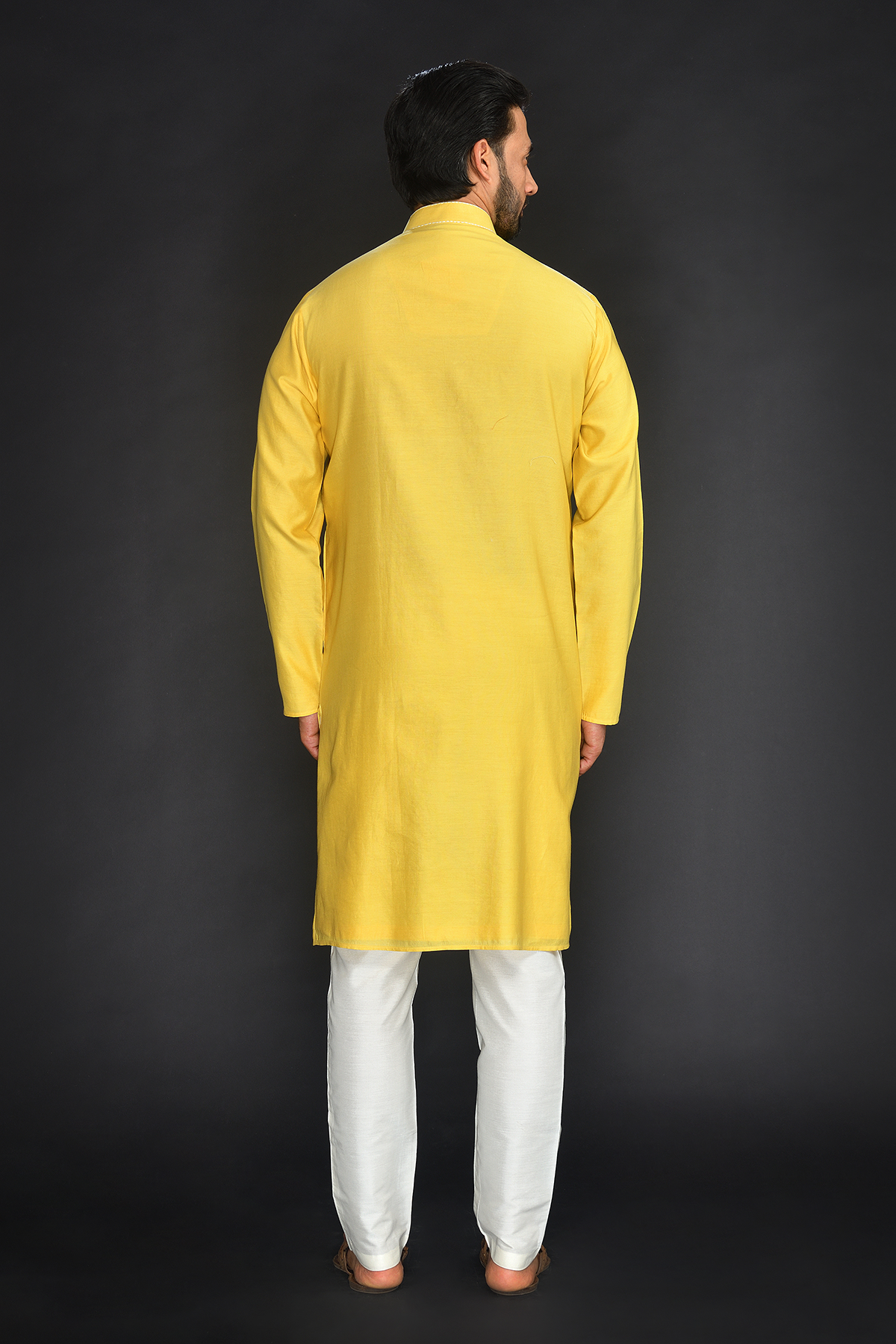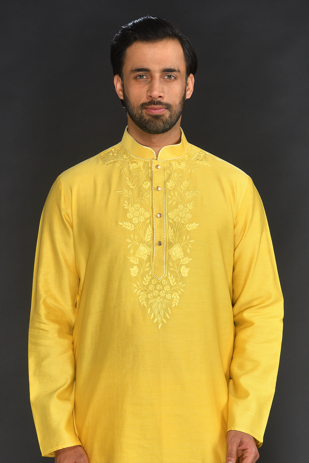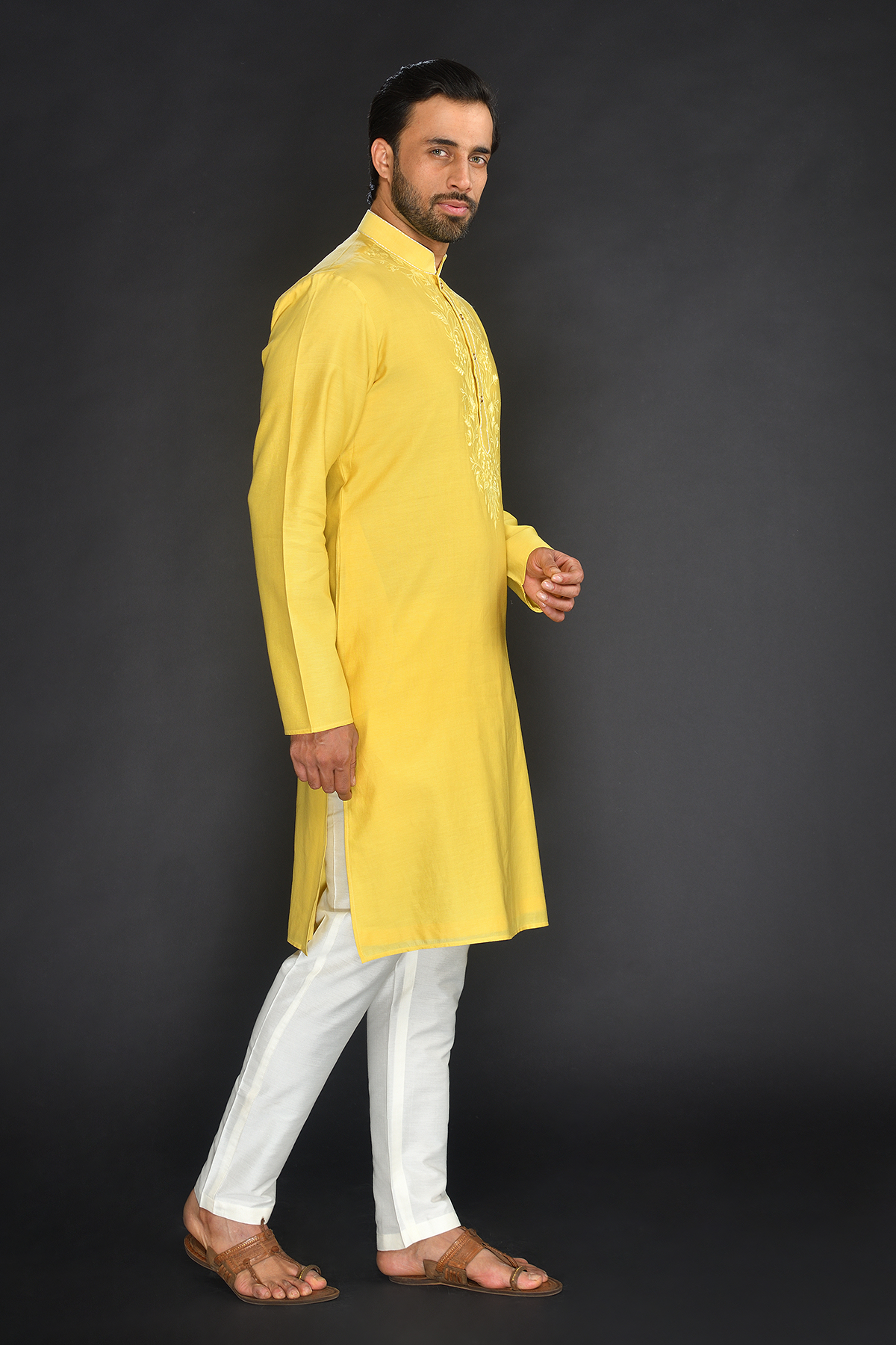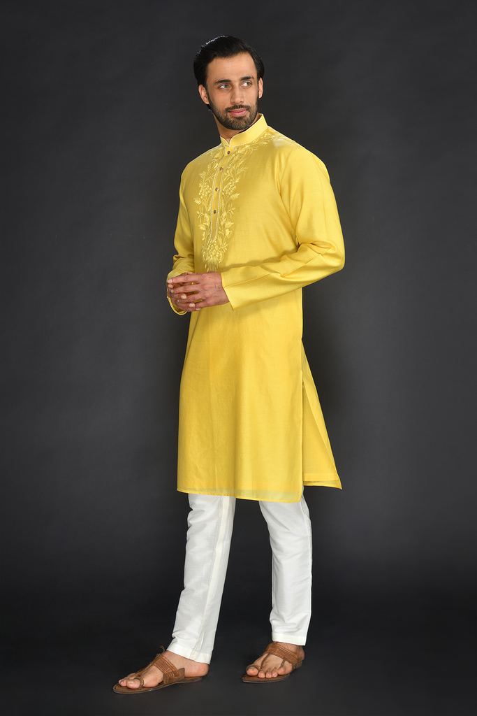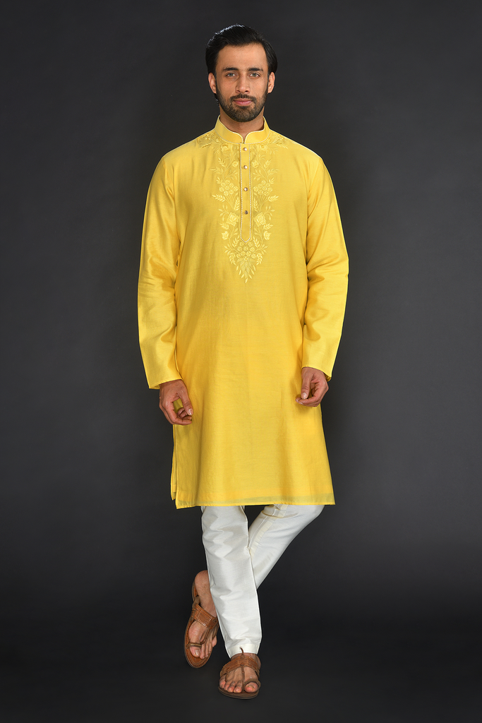 Yellow Pure Thread Embroidery Kurta with spun silk Off white Chudidar Bottom.