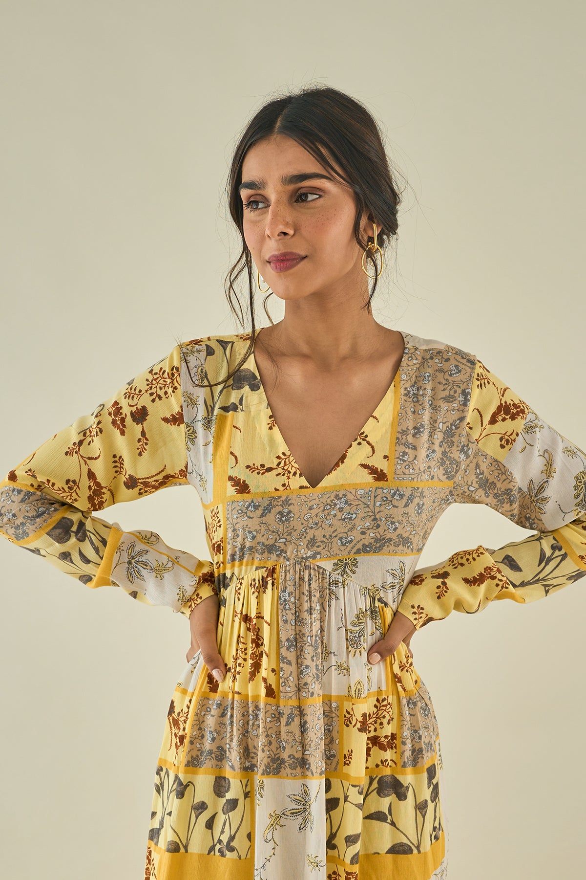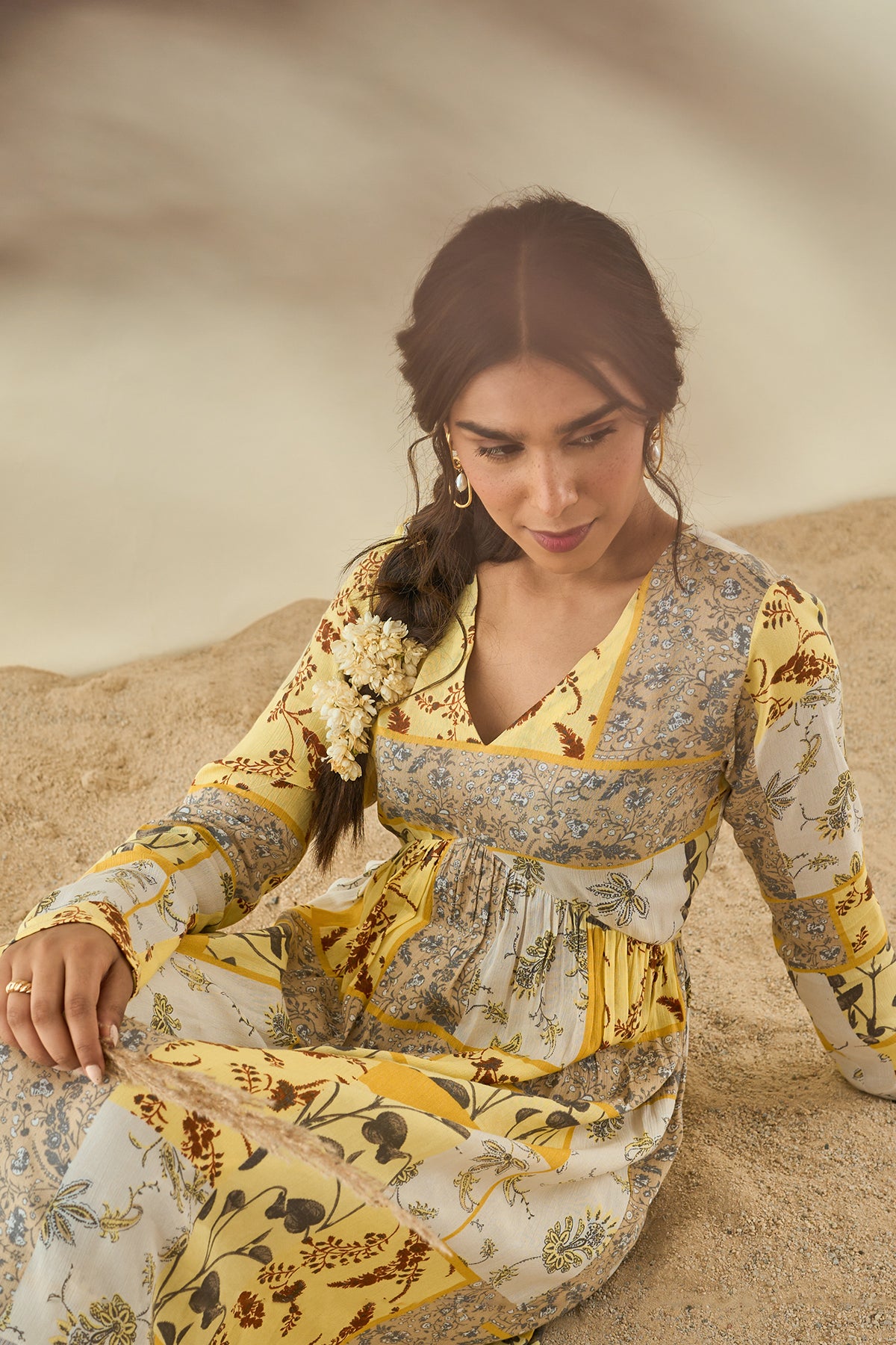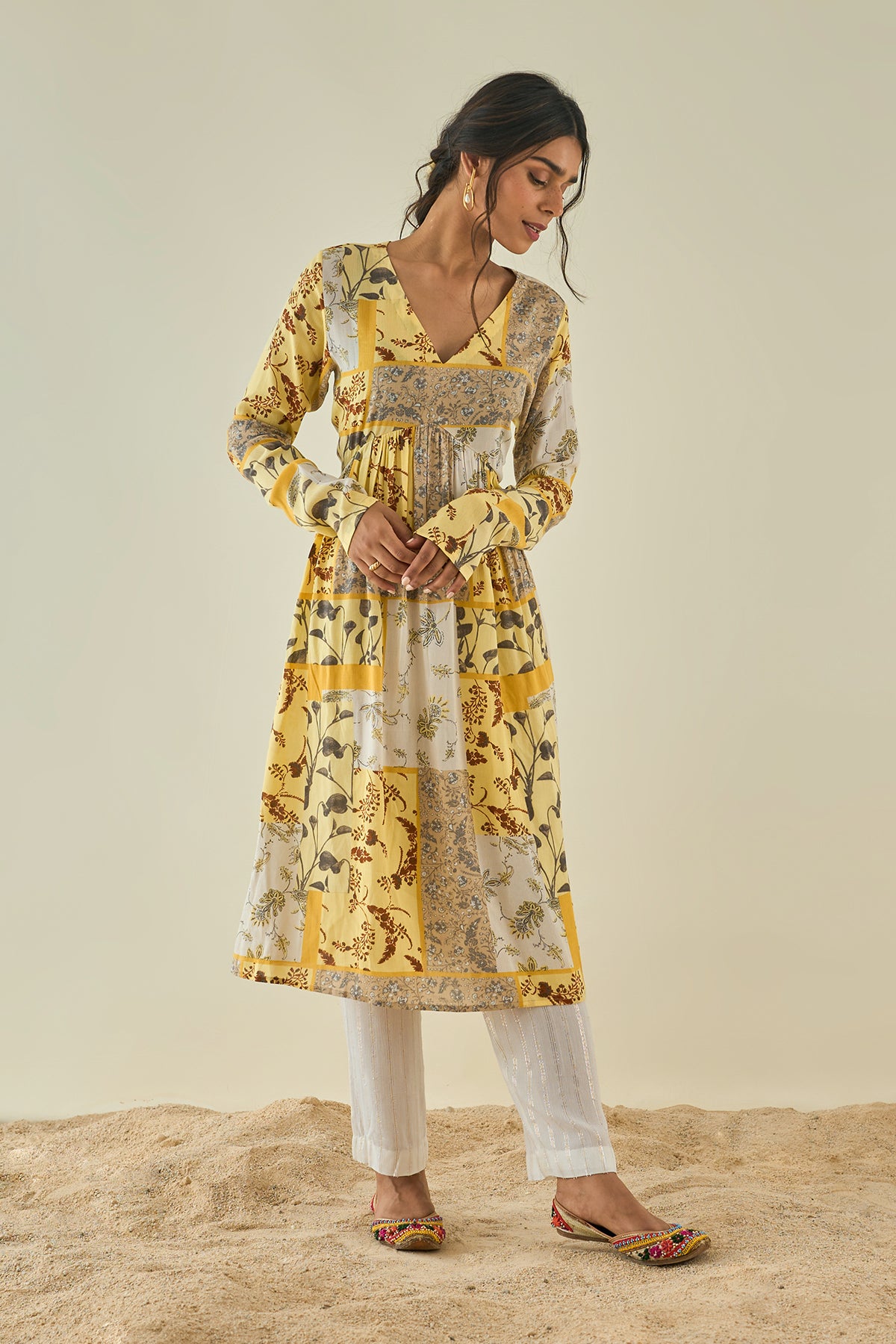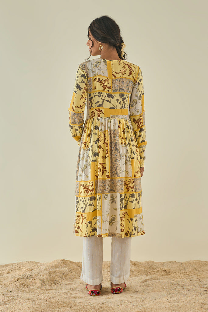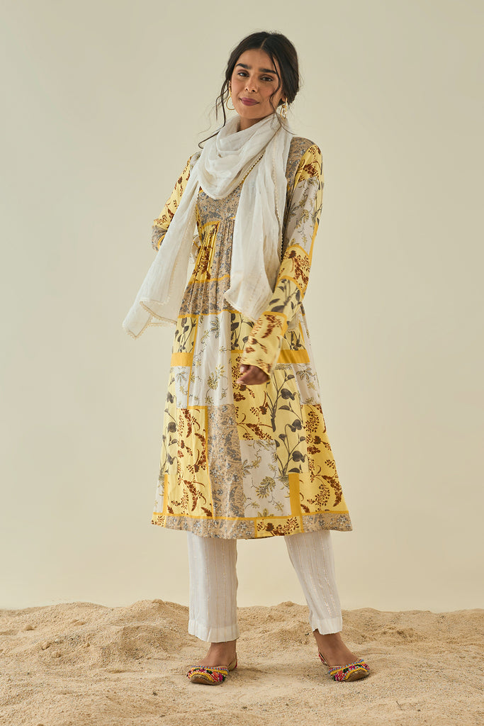 Vibrant print on cotton rayon flaired kurta with fore and hind gathers, churidaar sleeves ,in consonance with cotton shimmer pants and self cotton laced stall.