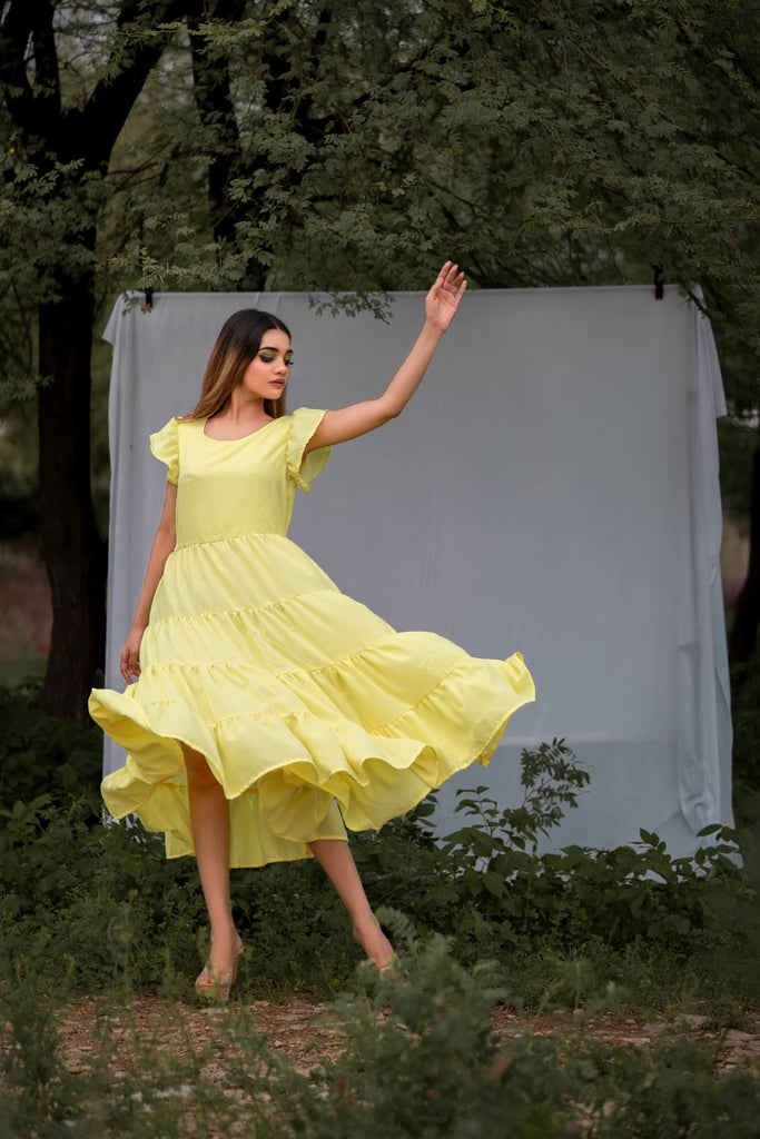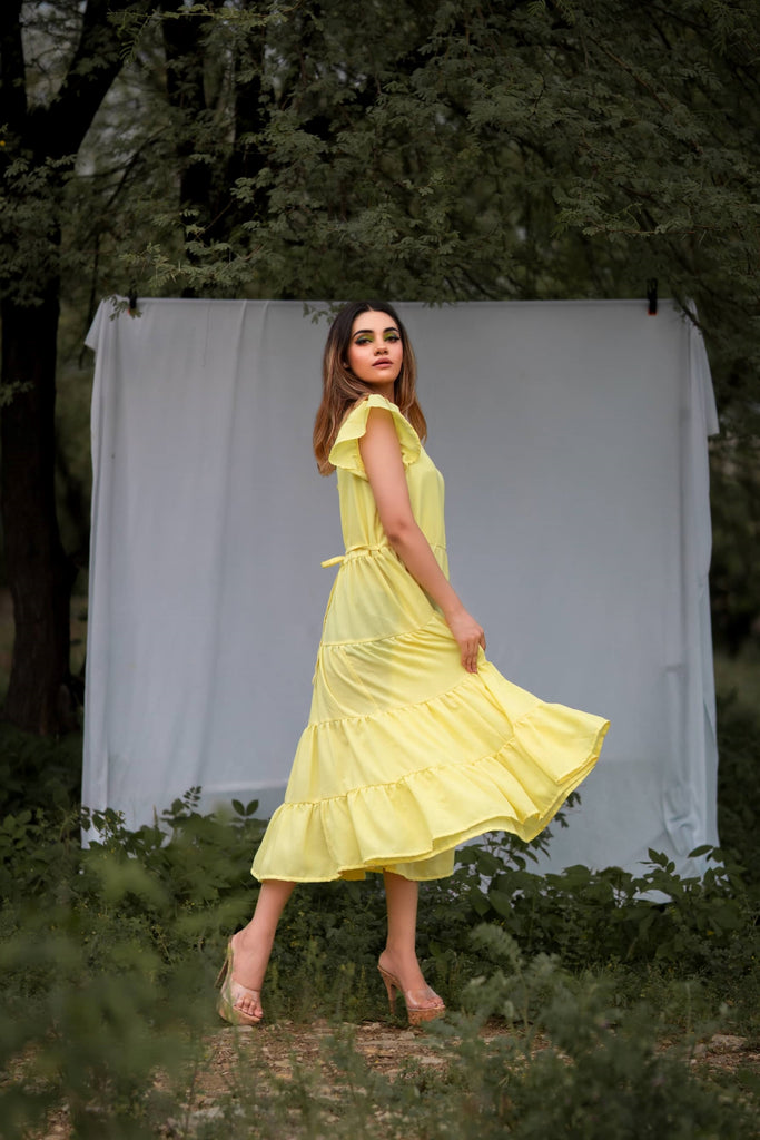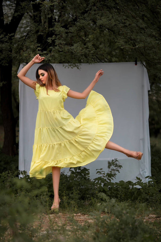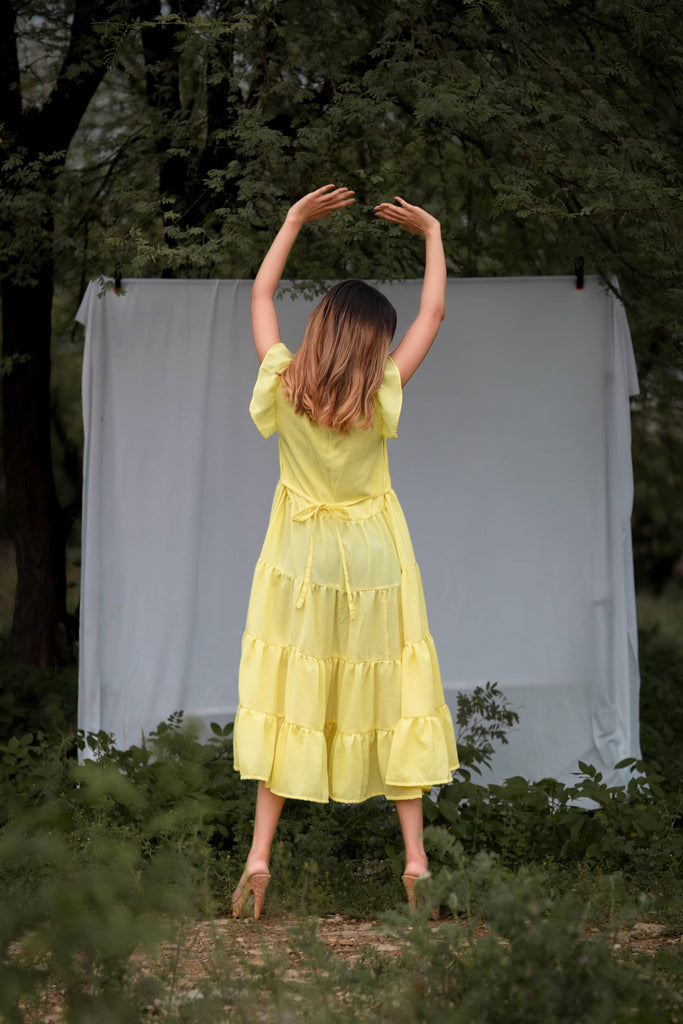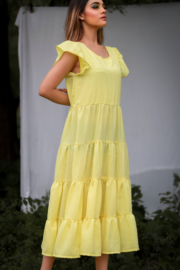 This yellowish tierd dress by MannMani is crafted in moss crepe and features a round neck, cute mini ruffle sleeves, tie knot at back and a regular fit. Pair this dress with heels and fine accessories to complete the look. Buy this dress online from MannMani .
