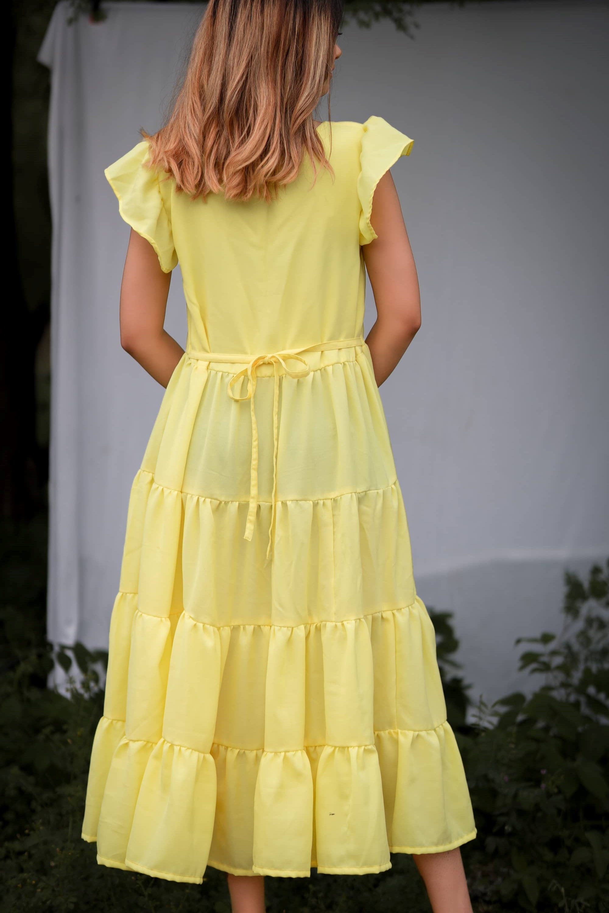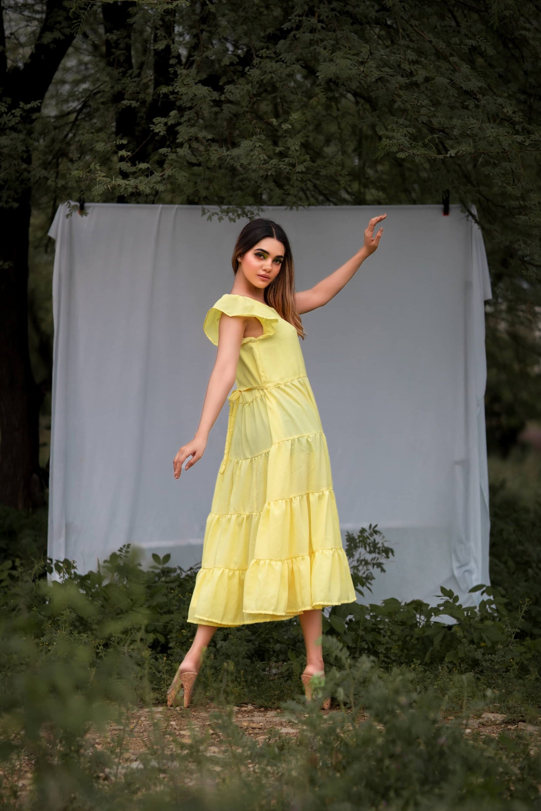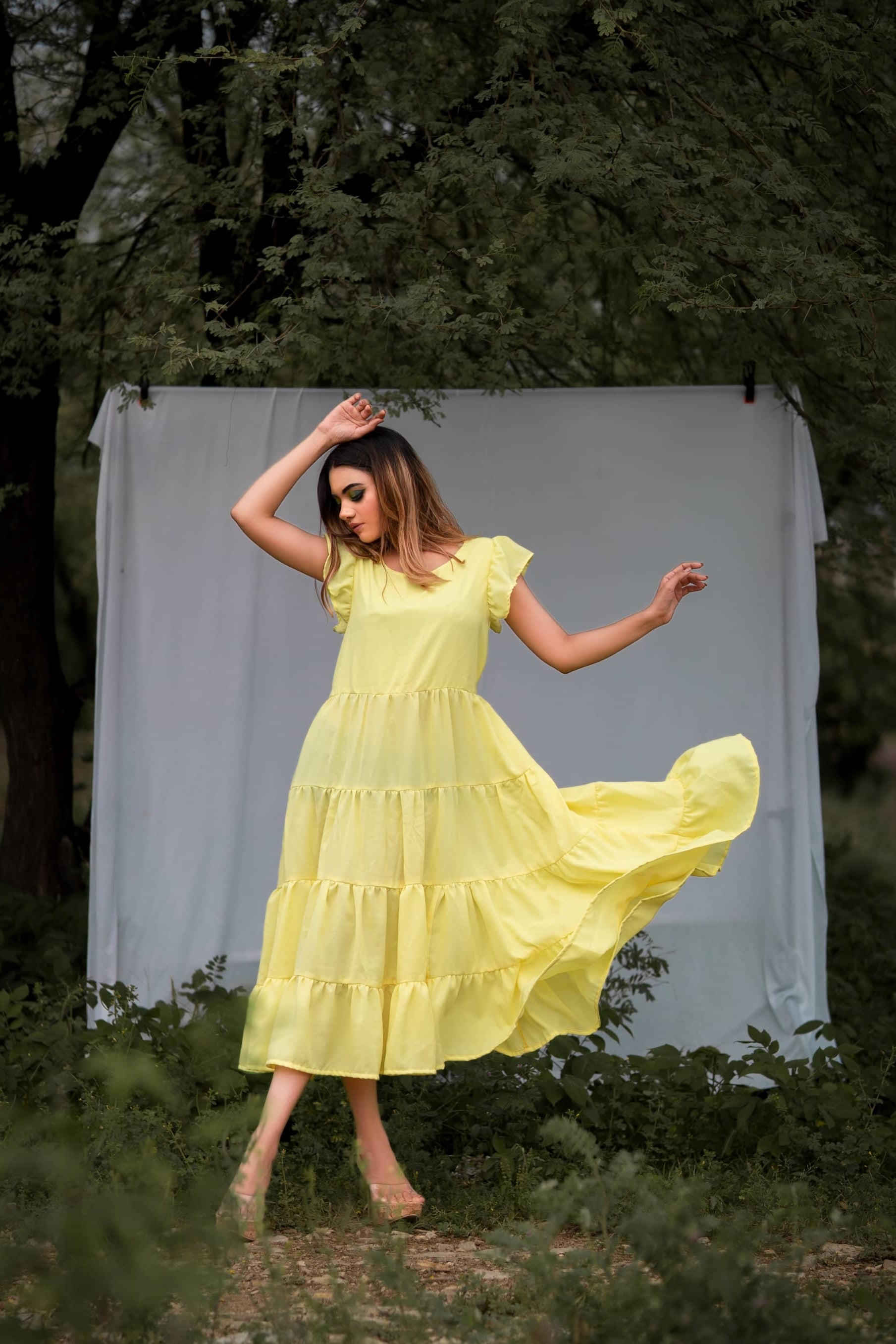 This yellowish tierd dress by MannMani is crafted in moss crepe and features a round neck, cute mini ruffle sleeves, tie knot at back and a regular fit. Pair this dress with heels and fine accessories to complete the look. Buy this dress online from MannMani .