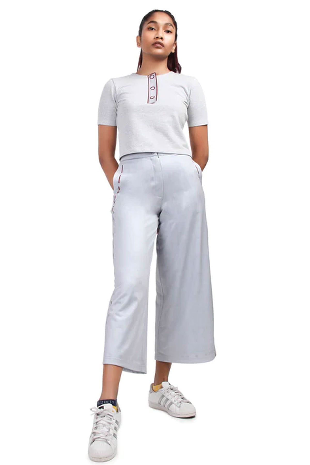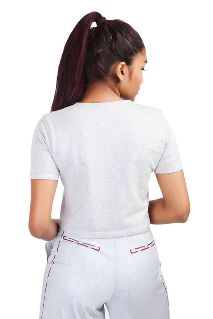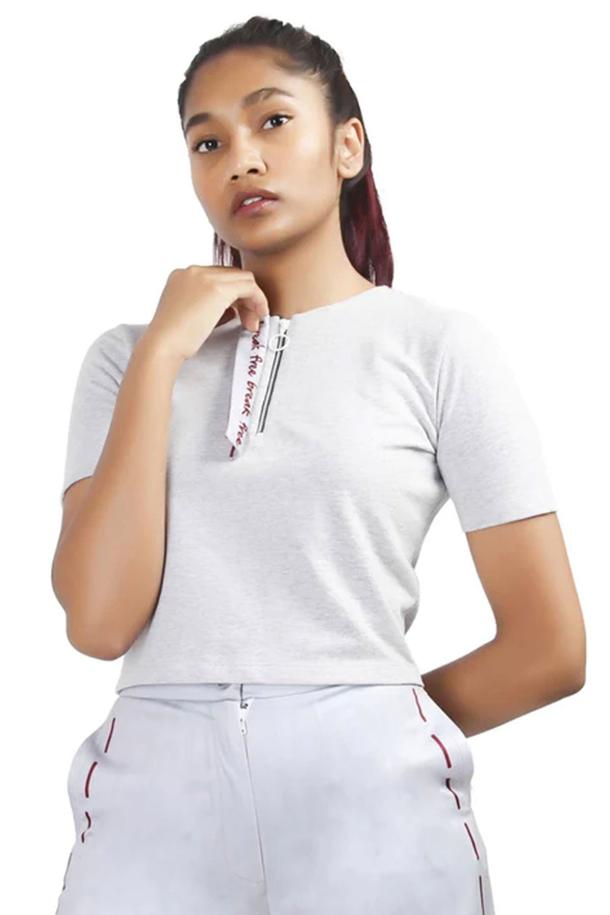 Short sleeve cotton t-shirt in grey. Crewneck collar. Half two-toned zip closure at front. Mesh zipper placket with buttons graphic. Inside placket "break free" printed in burgundy. Cropped hem.