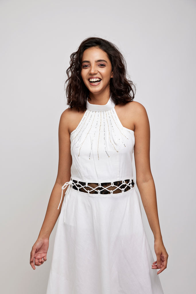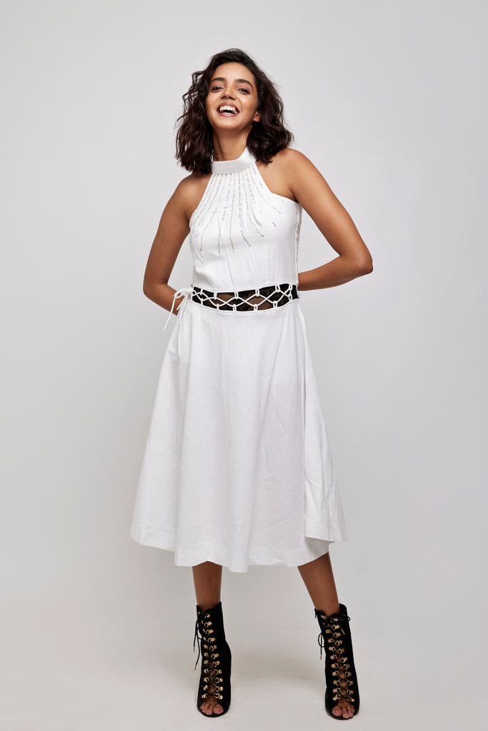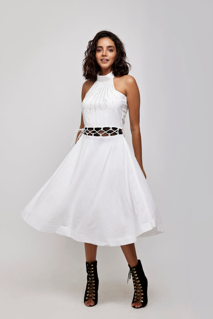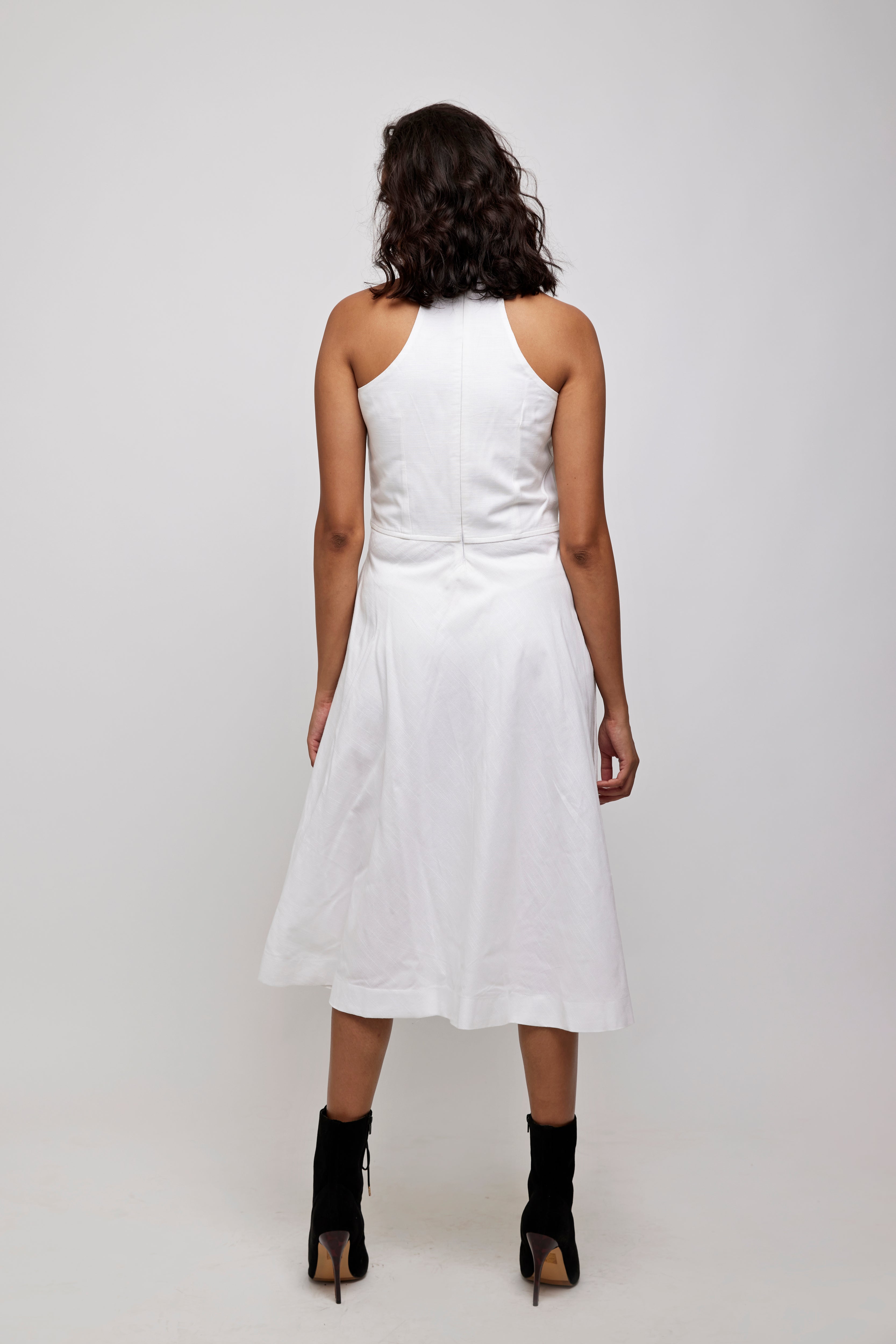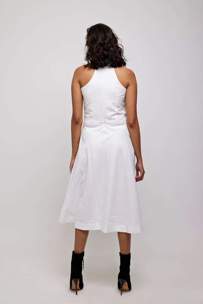 A Halter Dress half circular, calf length, with standard 4 dart. A herringbone ties up at front around the waist.